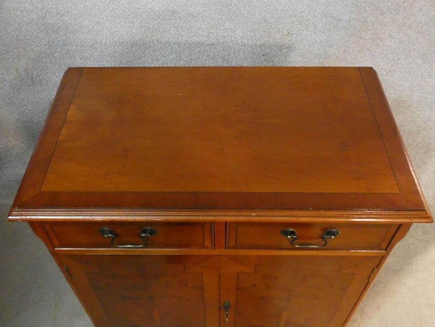 A Georgian style yew and crossbanded side cabinet. H.80 W.72 D.41cm