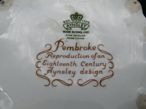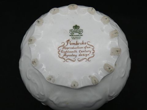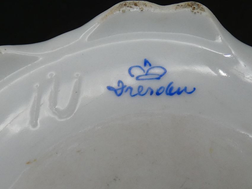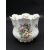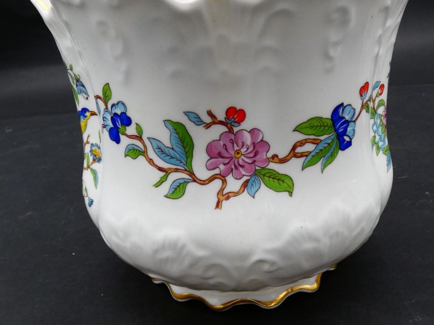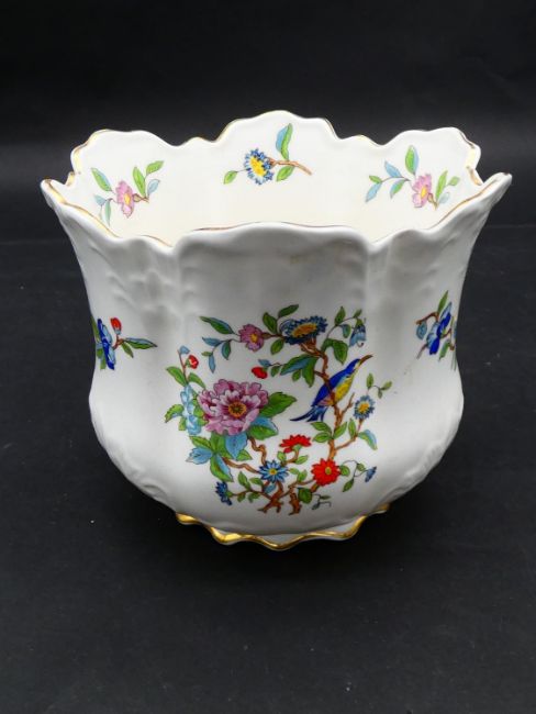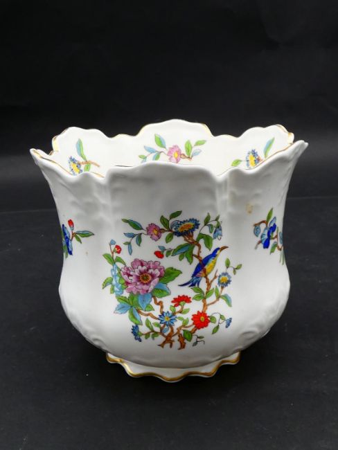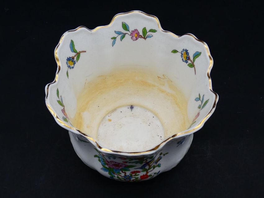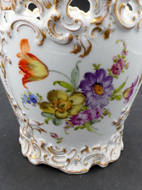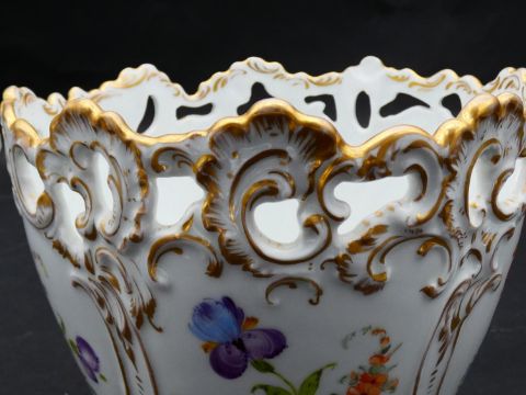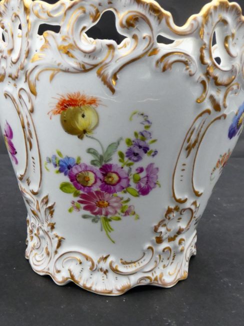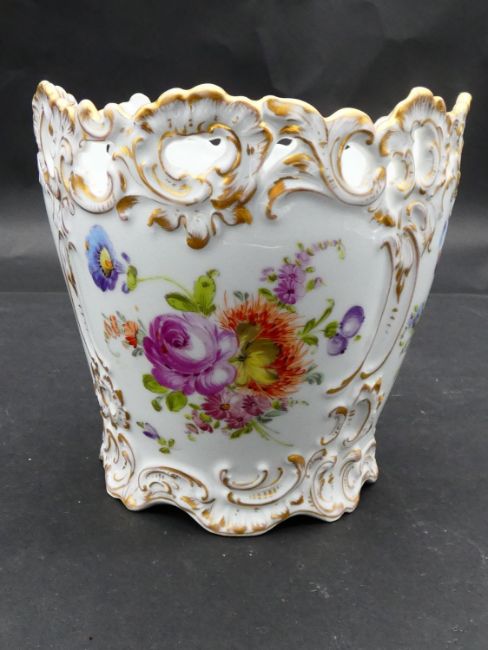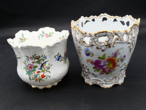 Two antique porcelain hand painted floral design cachepots. One Dresden, with a pierced scrolling gilded rim and the other Aynsley with a flower garland design. Makers mark to the base. H.17cm