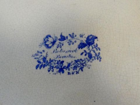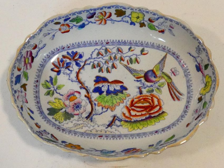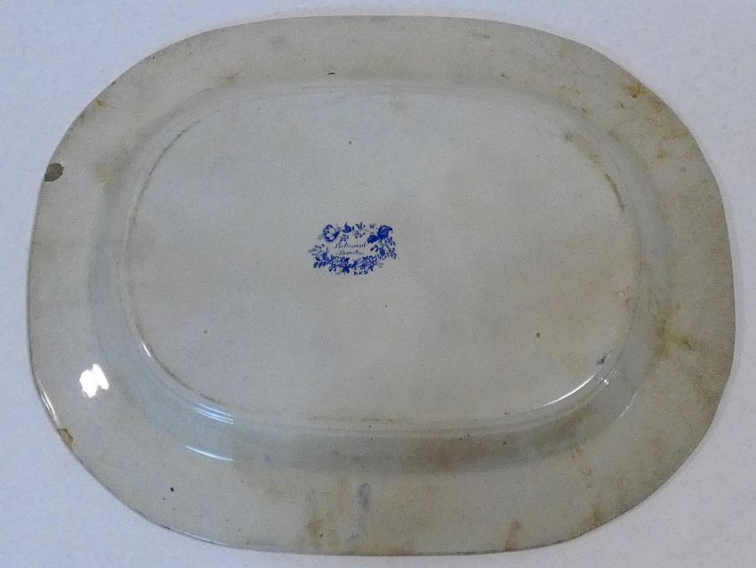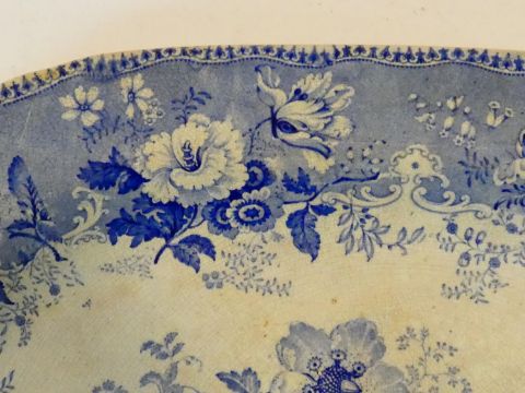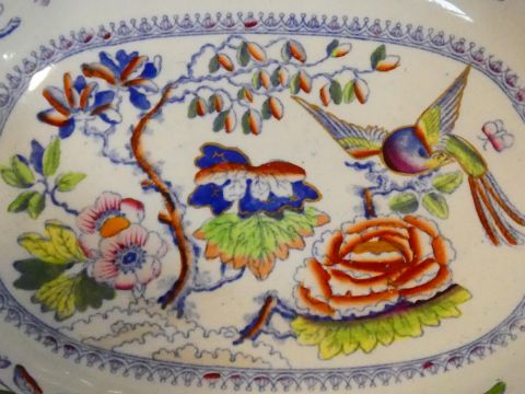 An antique ceramic blue and white transferware design meat platter with 'Botanical Beauties' design by Elkin and Newton along with an Ironstone hand coloured bowl, with bird and flower design. Makers stamp to the base. H.5 L.45 W.36cm