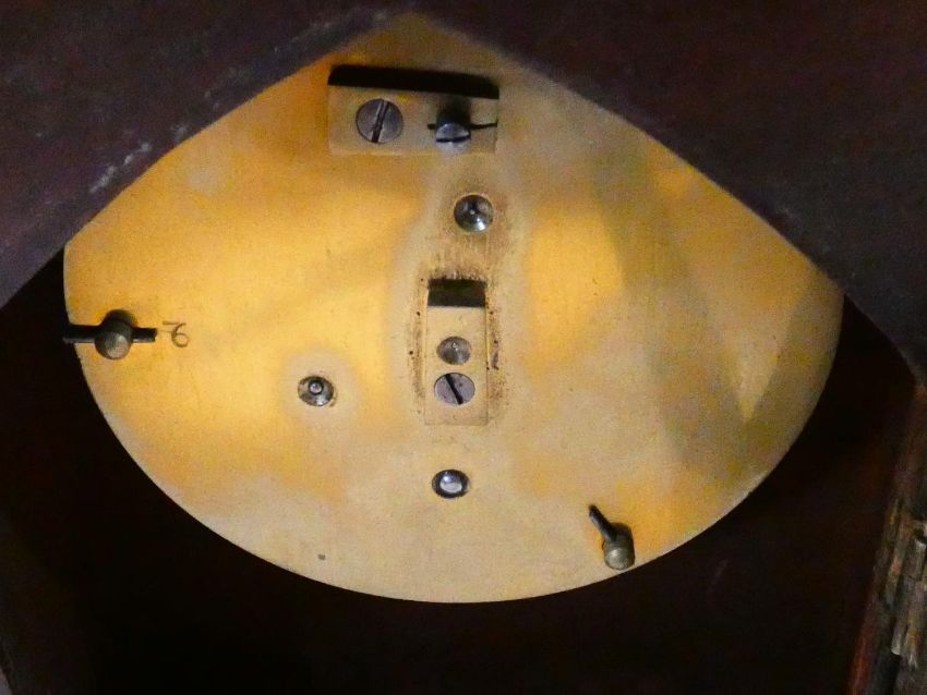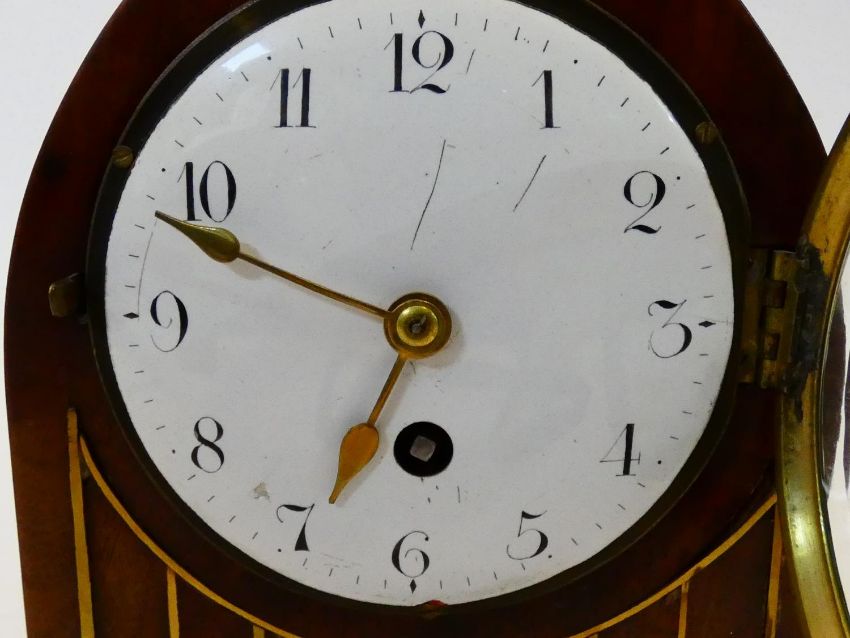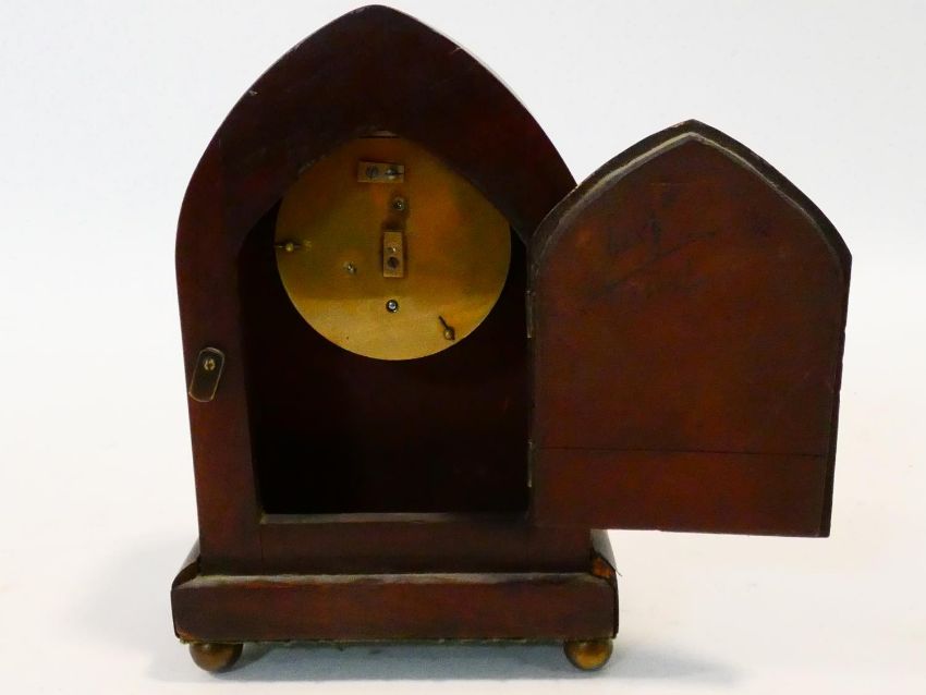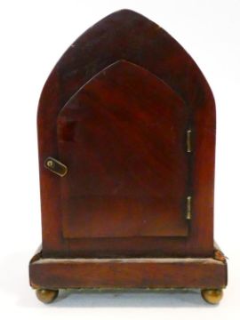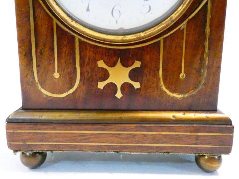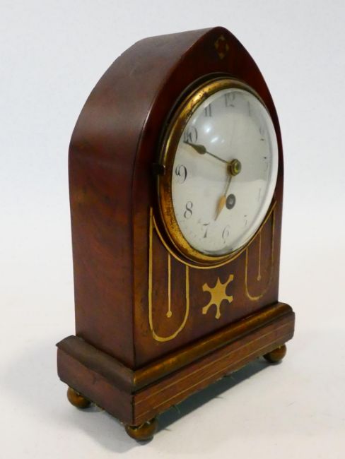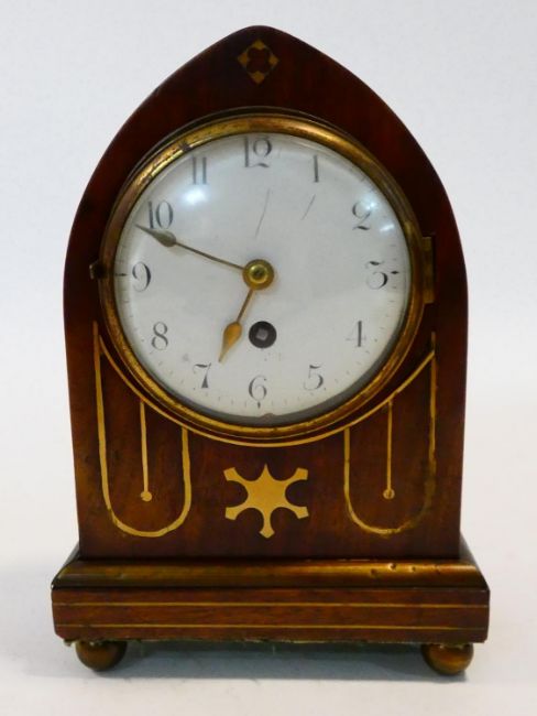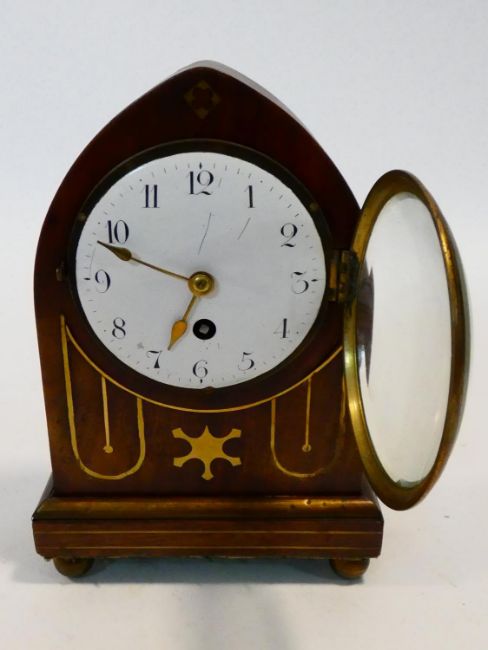 A Regency lancet bracket clock in brass inlaid mahogany case with white enamel dial and Arabic numerals resting on brass bun feet. No key or pendulum. H.24 L.16 W.8cm