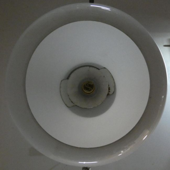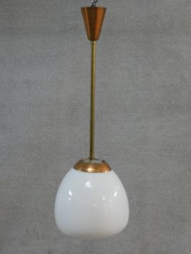 A mid century vintage copper ceiling pendant lamp with globular milk glass shade. H.83cm