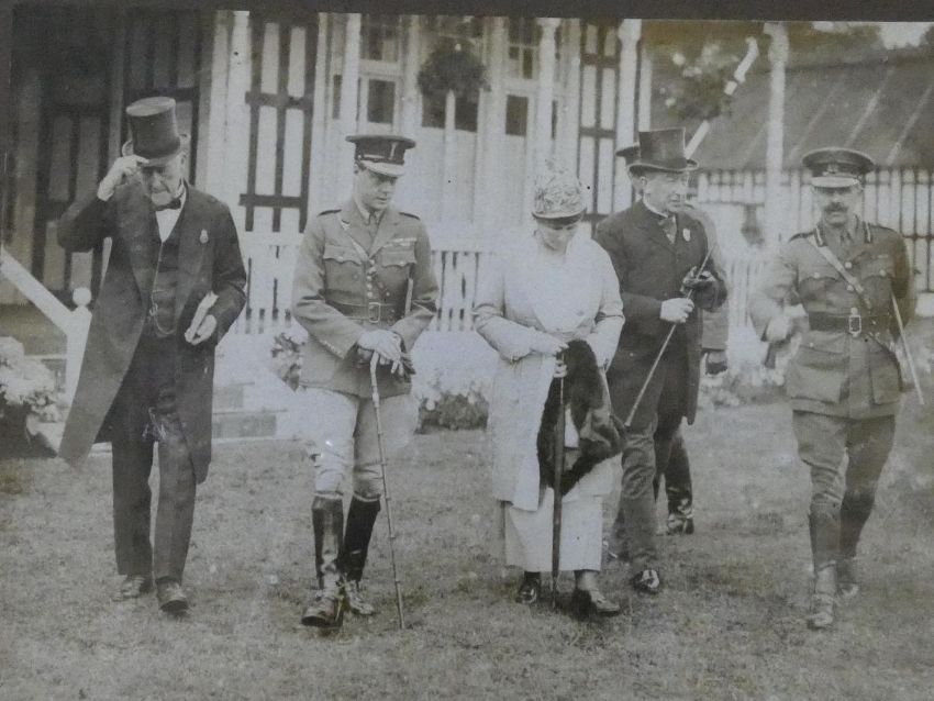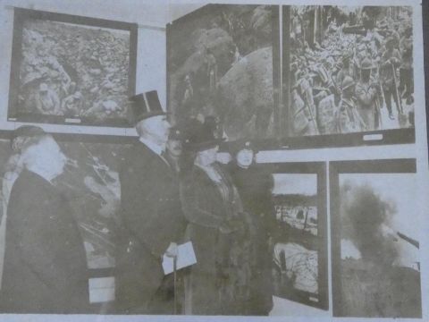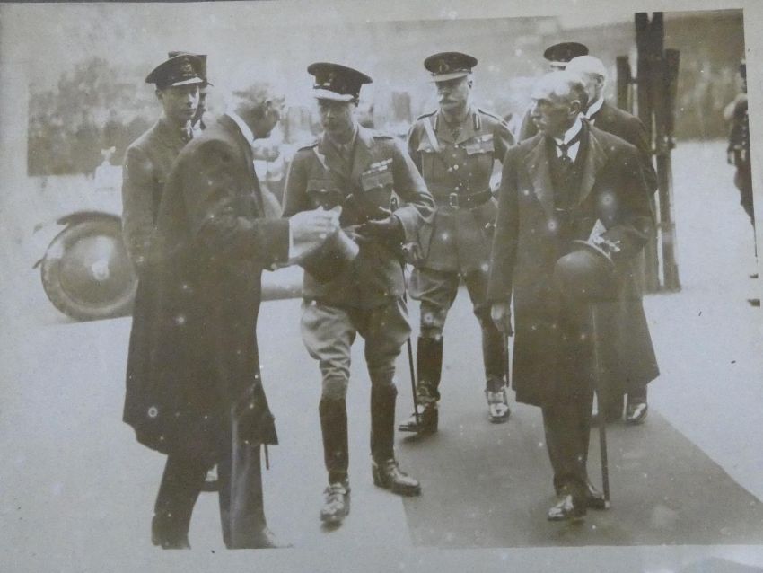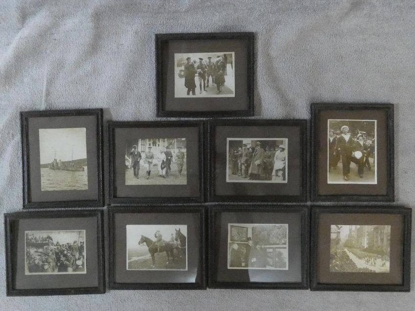 A collection of nine framed and glazed WW1 black and white photos. Depicting various wartime scenes some featuring Edward Prince of Wales, King George V with Field Marshal Haig, French President Poincare. Two with glass missing, one with glass damaged. H.28 W.33cm