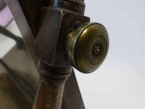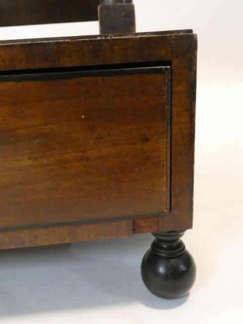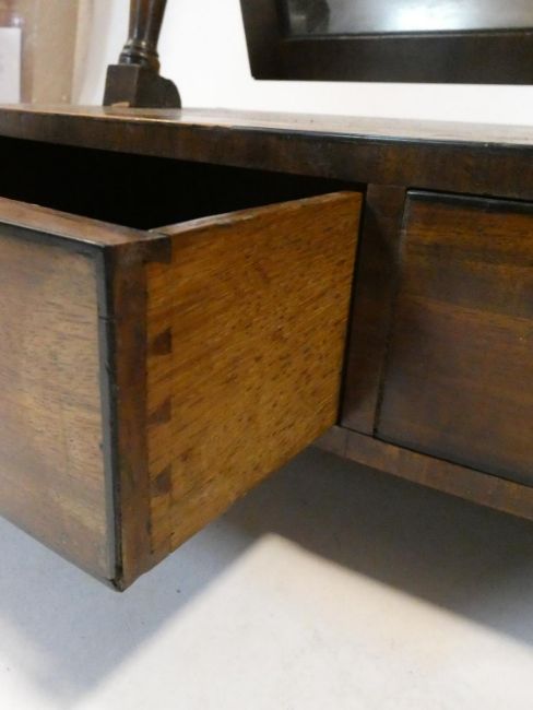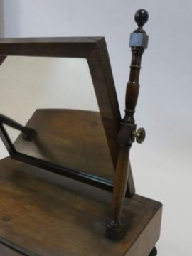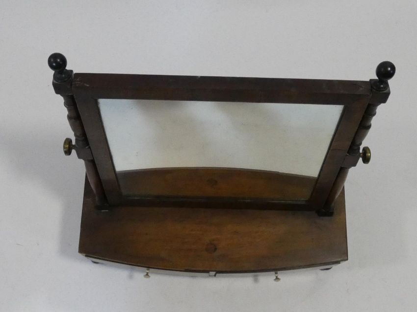 A Georgian mahogany swing toilet mirror fitted with original plate on bowfronted base with two drawers resting on bun feet. H.51 L.48 W.26cm