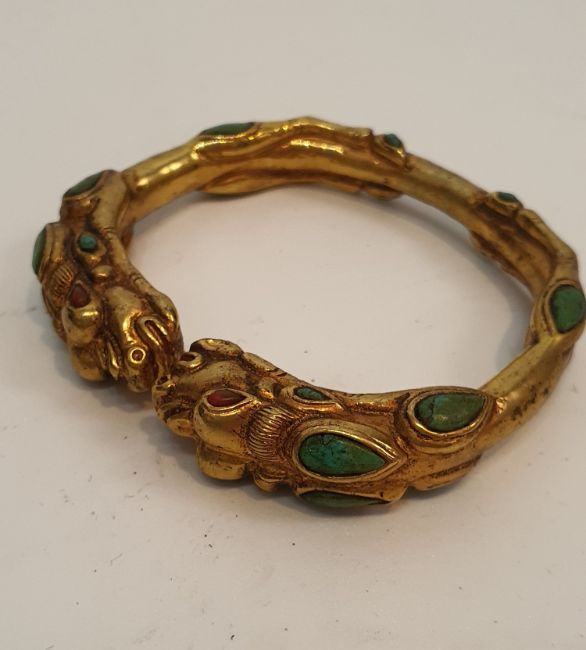 A Tibetan gilded bronze two headed dragon bangle inset with turquoise and red stone cabochons for the eyes. 7.5cm