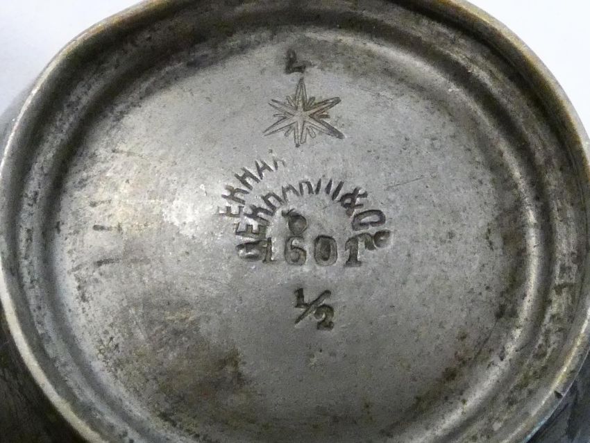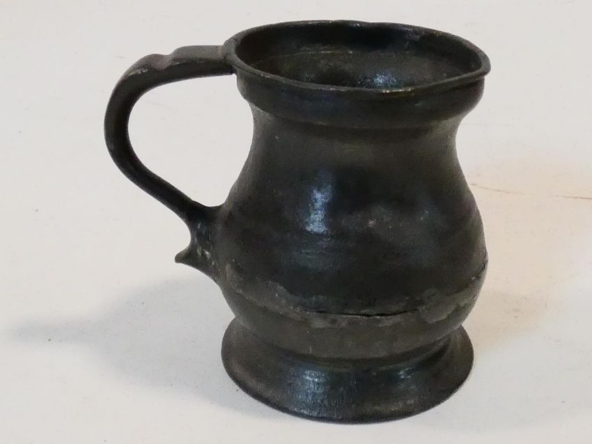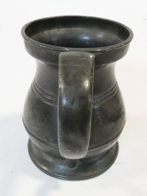 A collection of antique pewter items. Including plates, measures, pepper shaker, jug and tankards. Some with makers stamps. D.34cm
