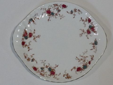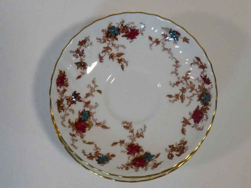A Mintons Ancestral pattern hand painted porcelain part dinner service, five dinner plates, side plates and serving plates and tea cups and saucers. L.20 W.9cm (serving plate)
