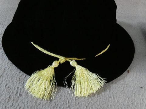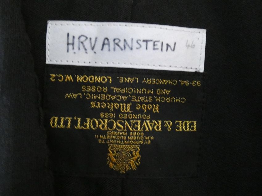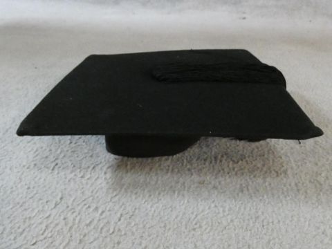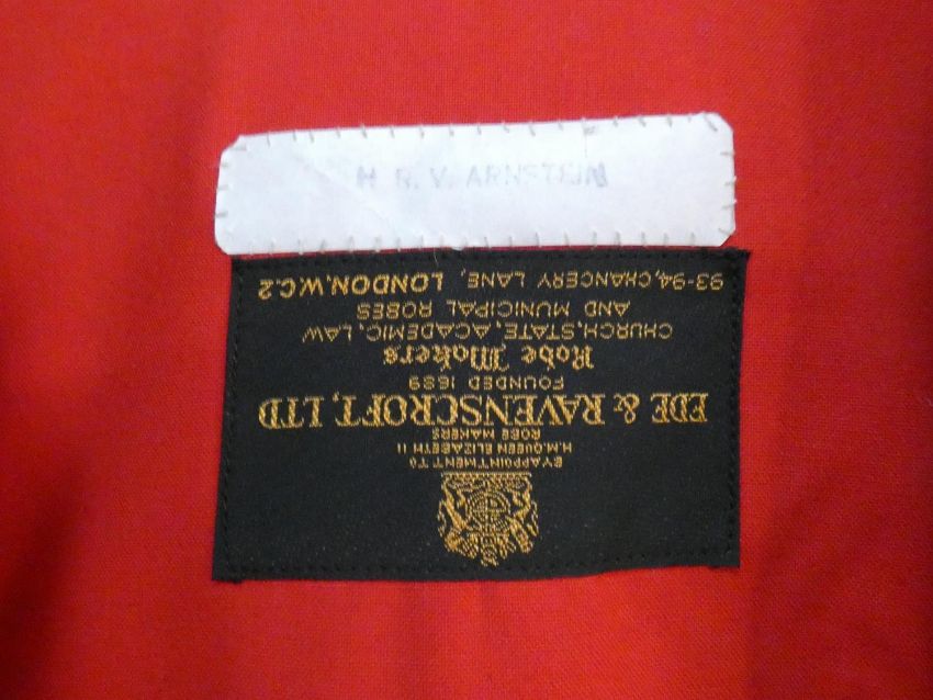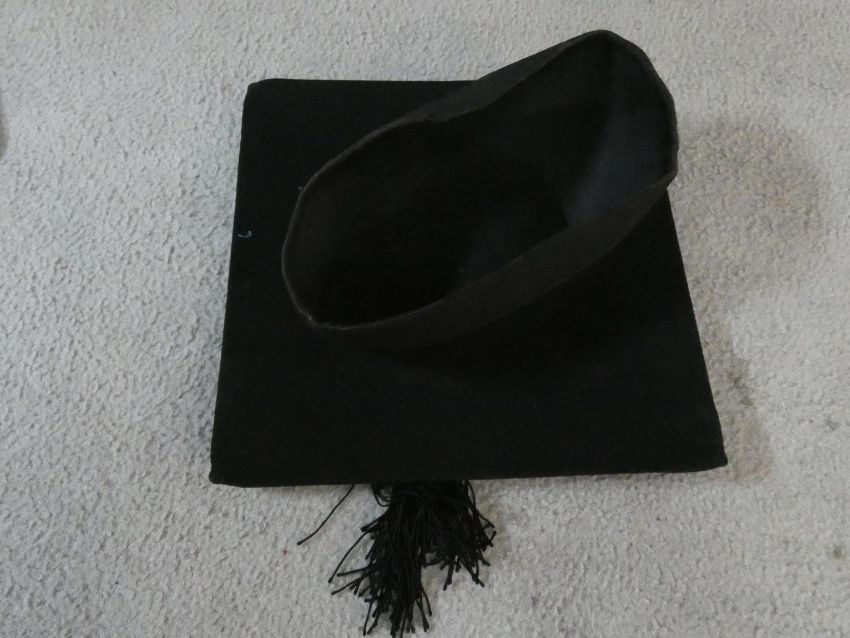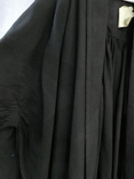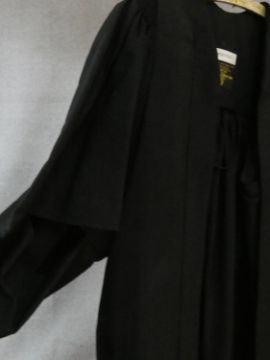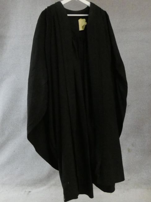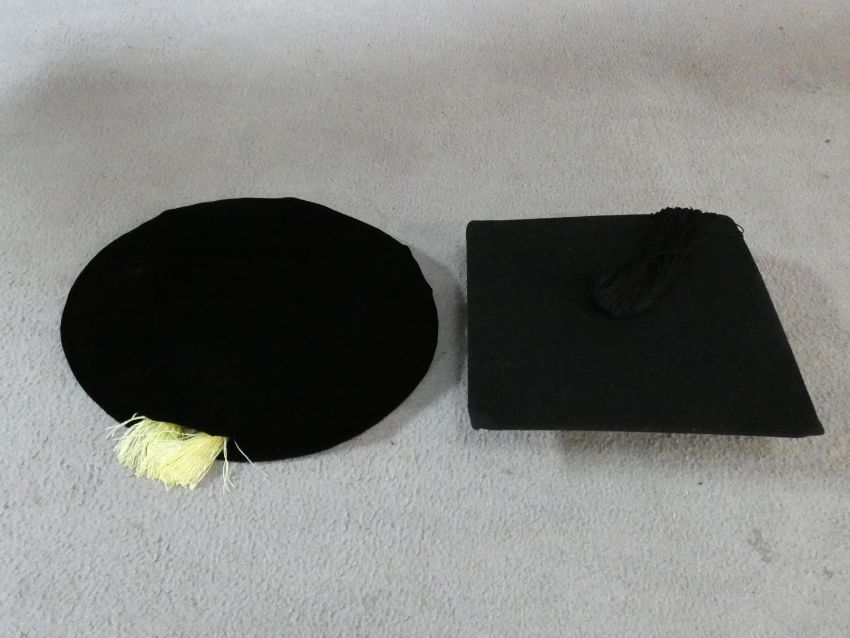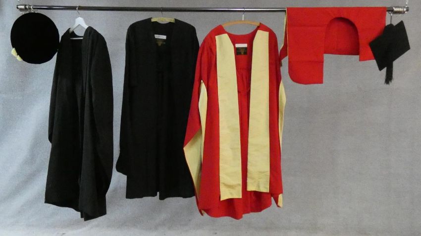 A collection of three various graduation gowns with a cap and a mortarboard, by Ede and Ravenscroft. 46 EU size. Including a DSc robe and cap from the University of London.