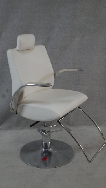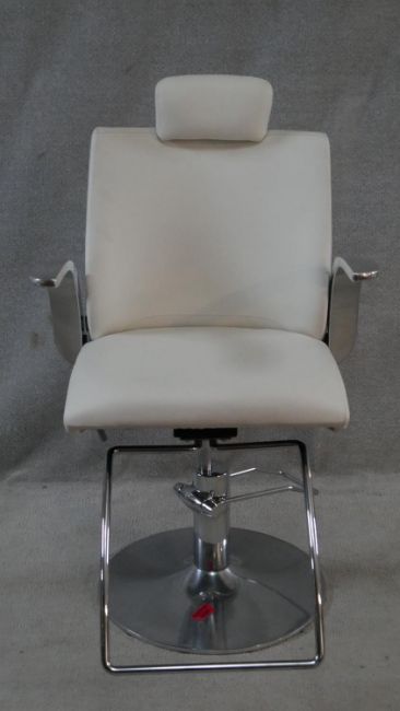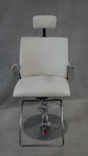 A retro styled adjustable swivel barbers chair in faux leather upholstery and aluminium frame. H.121cm (Fully raised)
