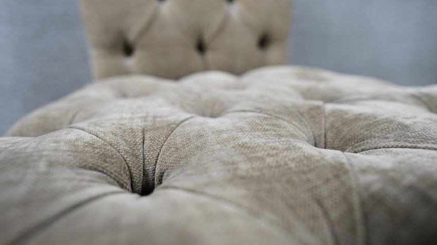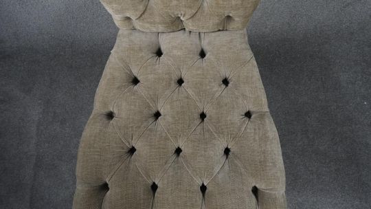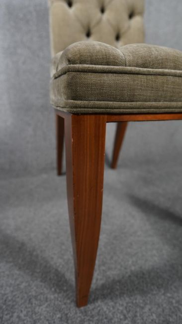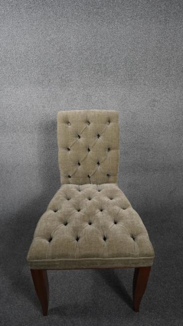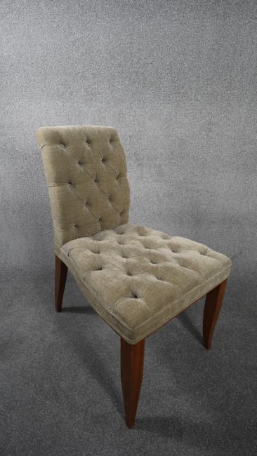 A Chelsea Harbour Design Centre side chair in deep buttoned and piped upholstery raised on slender sabre supports. H.88 W.51 D.57
