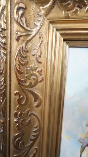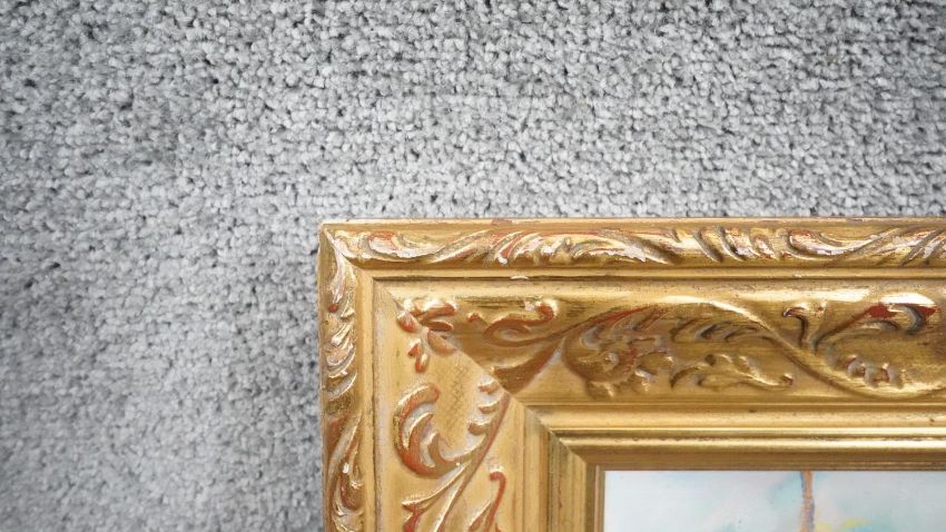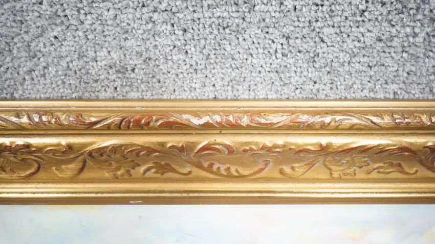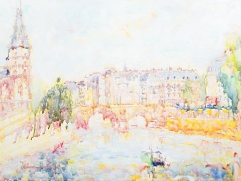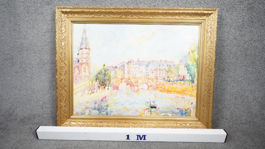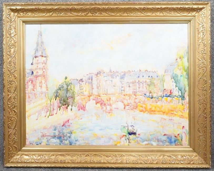 A gilt framed oil on canvas city river landscape, indistinctly signed, label verso. H.72 W.89