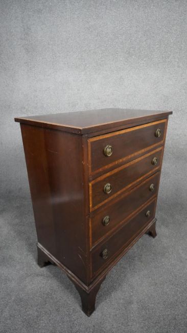 A Georgian style mahogany and satinwood crossbanded small chest of four drawers on swept bracket feet. H.76 W.61 D.38