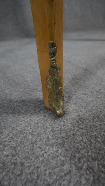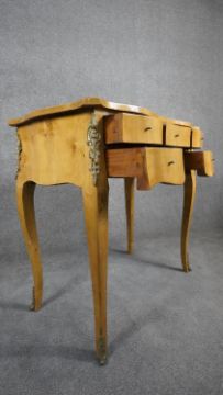 A Louis XV style burr maple kneehole writing table with ormolu mounts on slender cabriole supports. H.79 W.78 D.45