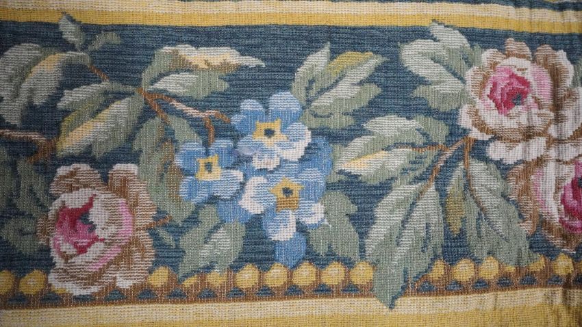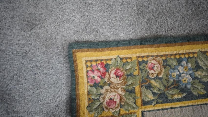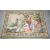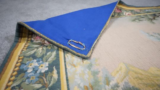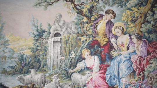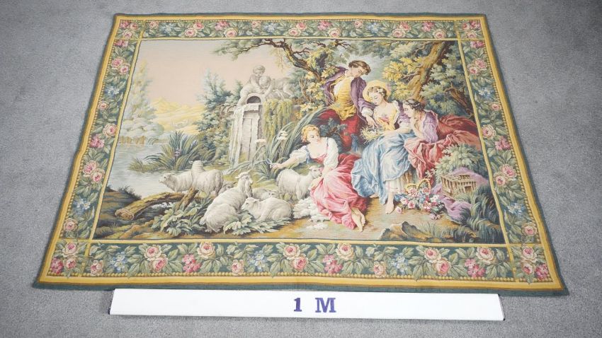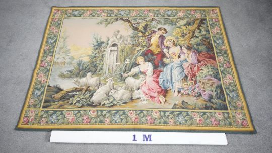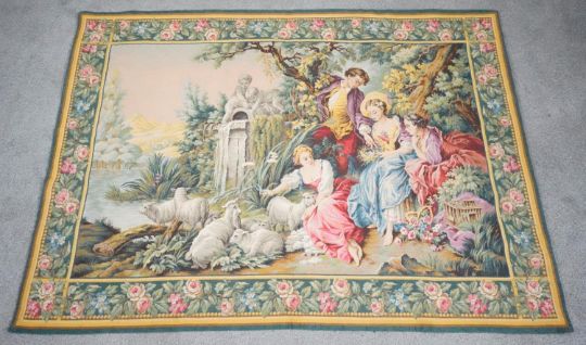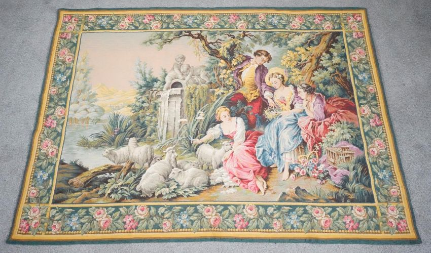 A vintage Aubusson style tapestry wall hanging depicting a garden with people by a lake with sheep surrounded by a floral and foliate border. H.104 W.143