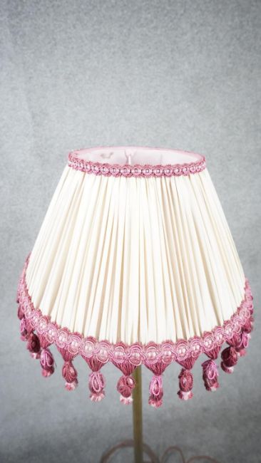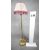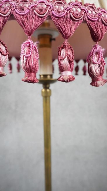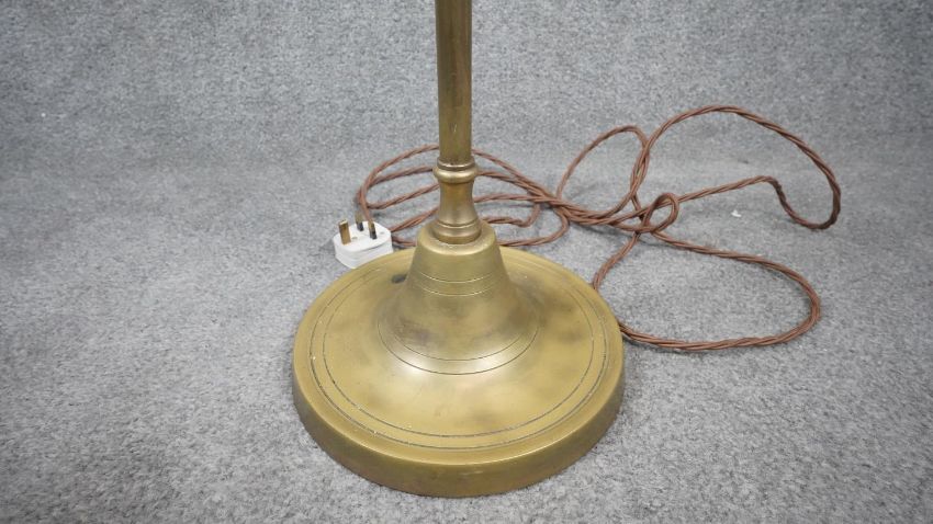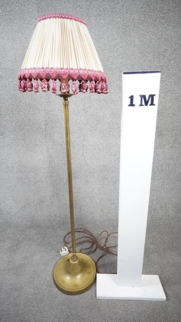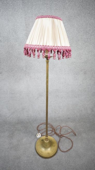 A vintage solid brass weighted base height adjustable standard lamp with silk wrapped cord and pink tassel cream pleated silk shade. H.124