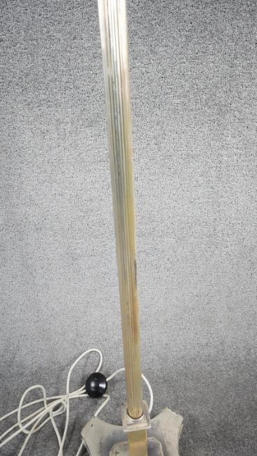 A vintage silver plated height adjustable two bulb standard lamp with reeded column, X-shape base and floral design to the top. H.144