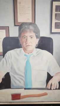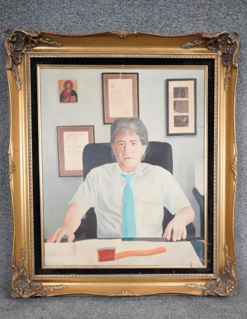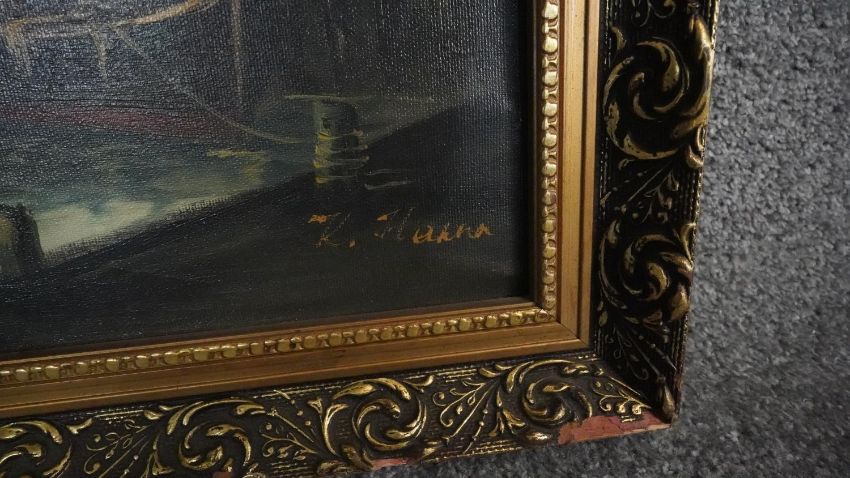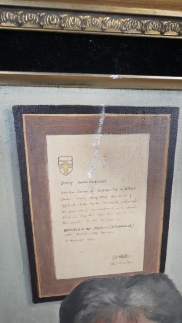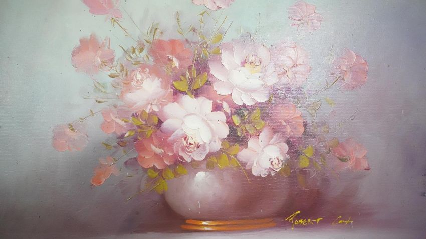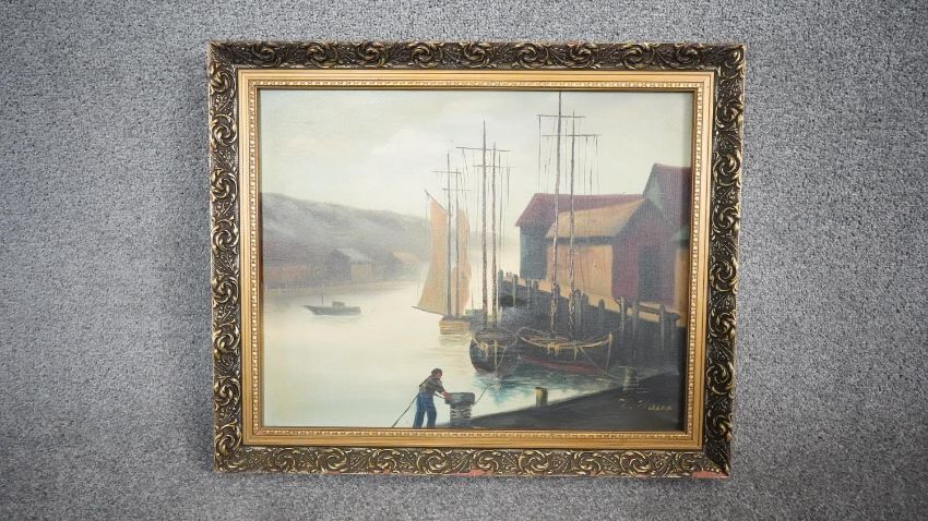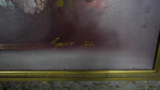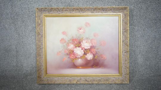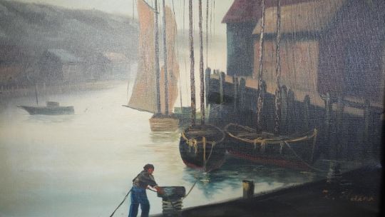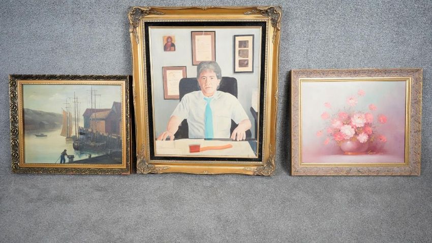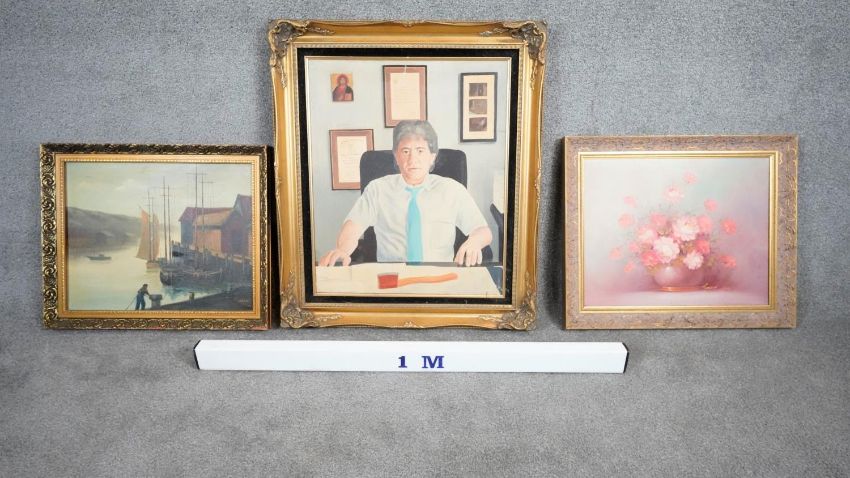 Three framed oils on canvas. Including a still life of a vase of flowers, signed Robert Cox, a portrait of a man behind his desk with an axe, unsigned and a harbour scene, signed K. Hanna. H.78 W.68