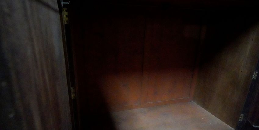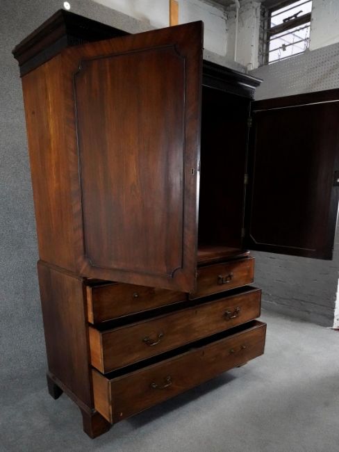 A Georgian mahogany linen press with dentil cornice above panel doors enclosing hanging space above two short and two long drawers on bracket feet. H.194 W.123 D.54 (two handles detached as photographed).
