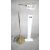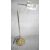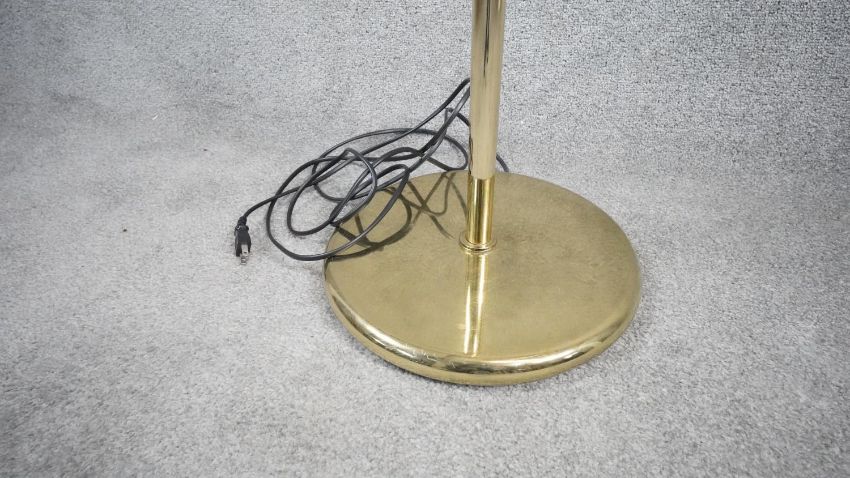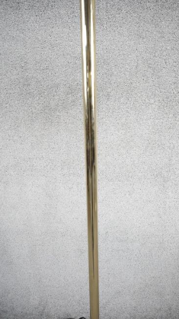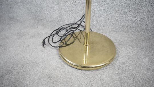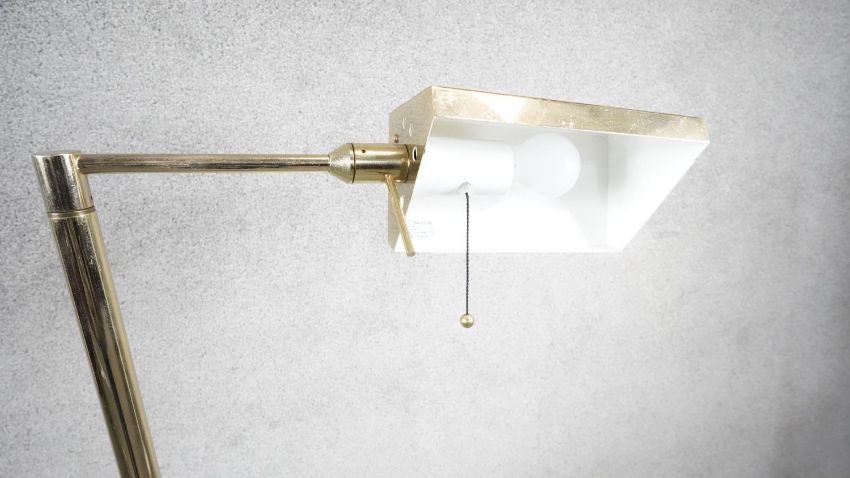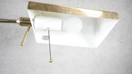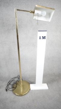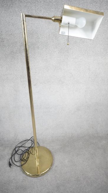 A vintage solid brass swing arm floor lamp with triangular shade, painted white interior and circular weighted base. Two pin plug. H.128