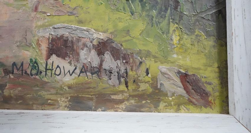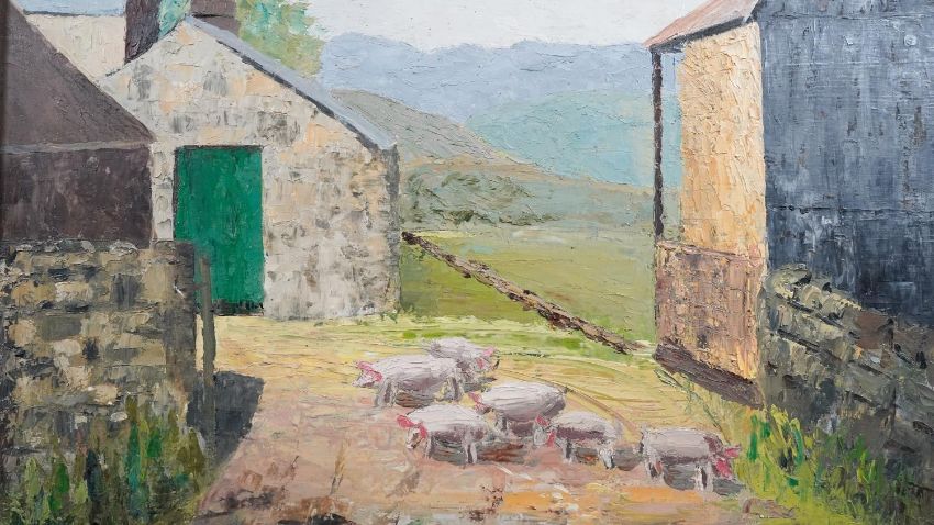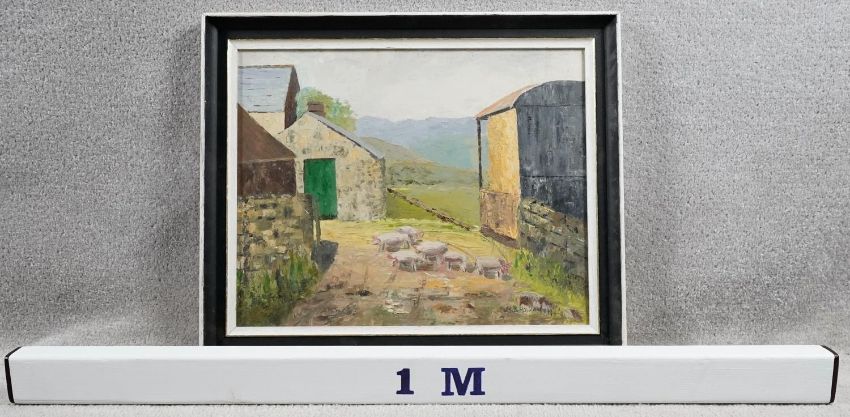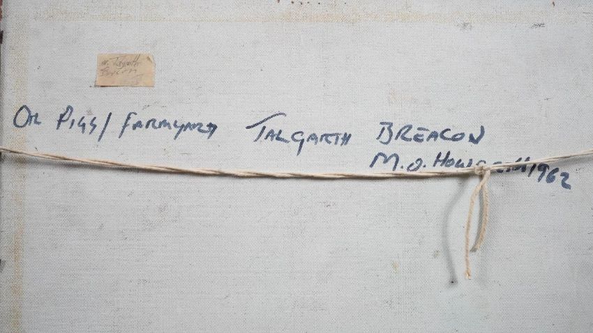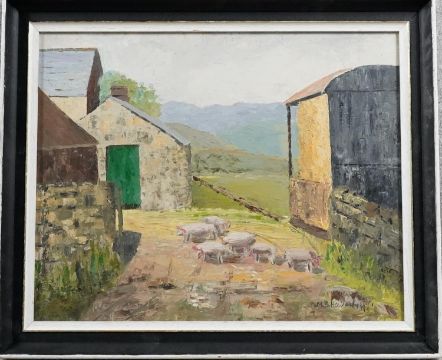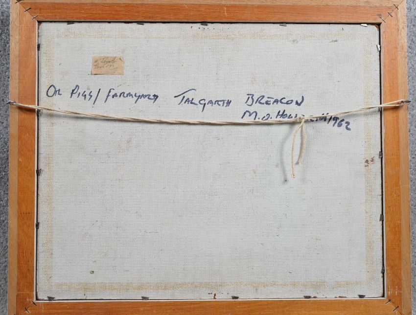 A framed oil on canvas, pigs in a farmyard in Breacon, signed M O Howarth and inscribed to the reverse. H.48 W.59cm