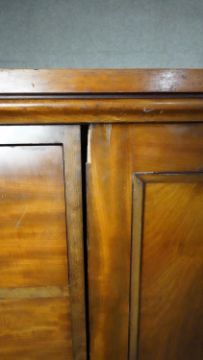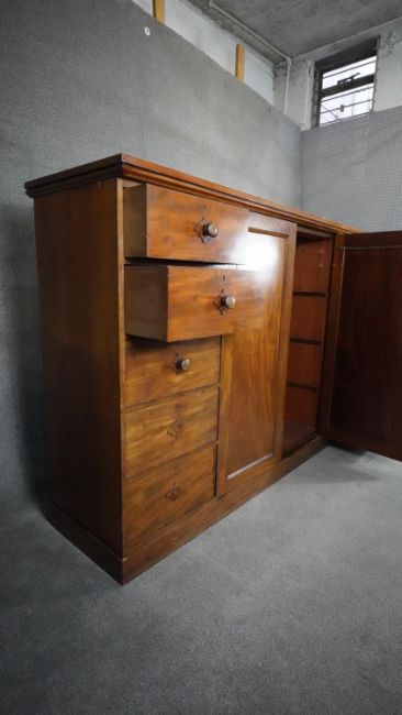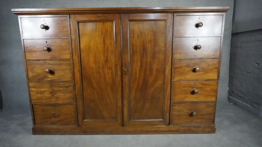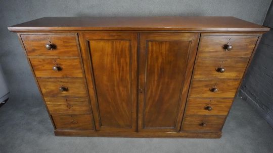 An mid 19th century mahogany linen cupboard with central panel doors flanked by two banks of four drawers on plinth base. H.138 W.214 D.15