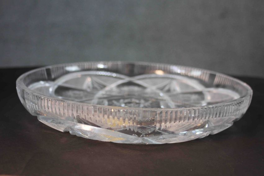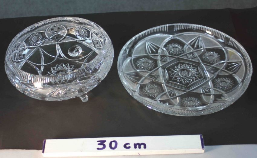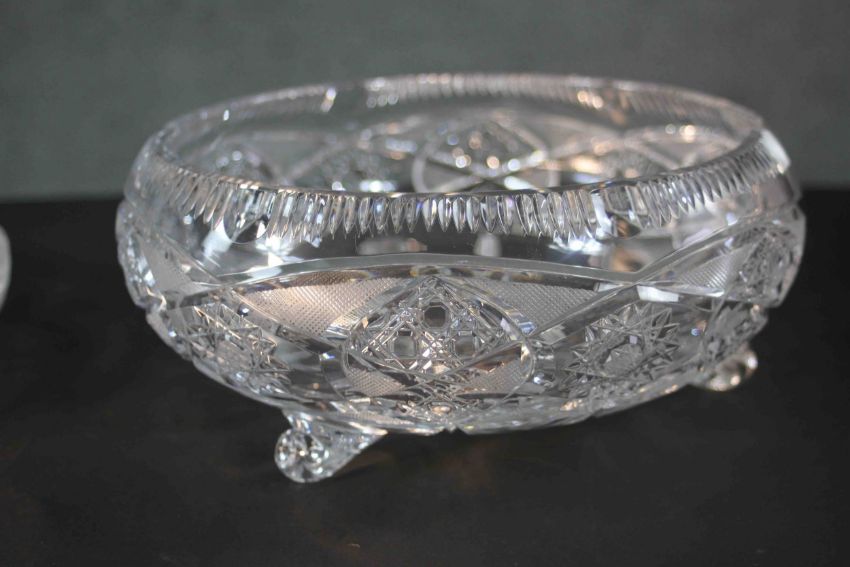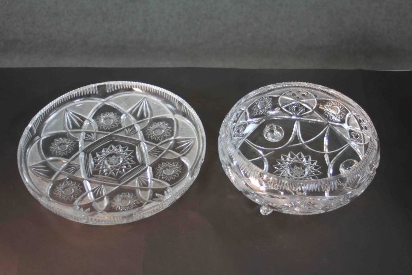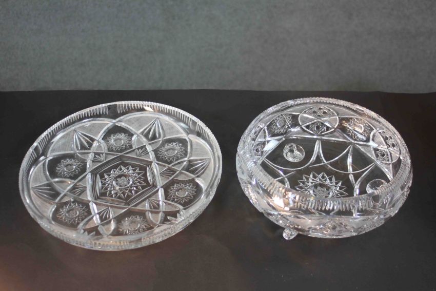 Two hand cut crystal bowls. One on three feet and one large serving dish. They both have a stylised foliate and star design. Diameter: 29cm(Largest)
