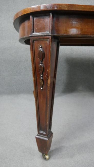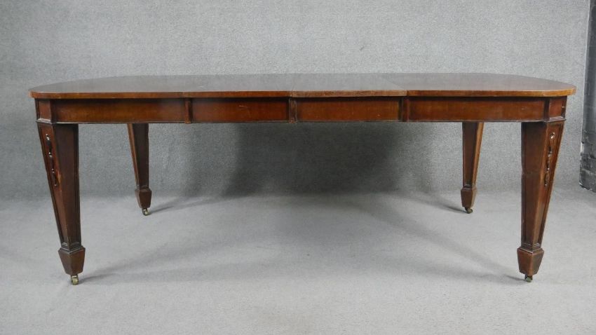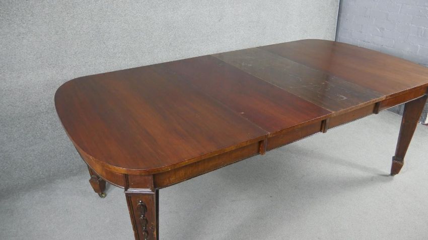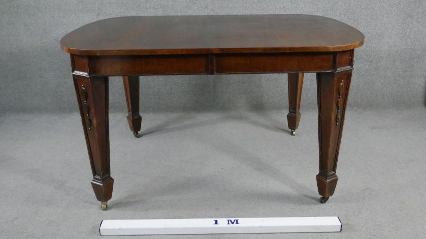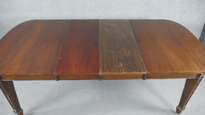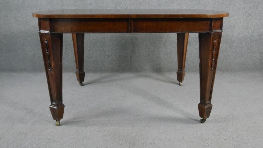 A C.1900 mahogany extending dining table with two extra leaves on husk carved square tapering supports. H.75 W.136 D.103cm (W.211cm extended)