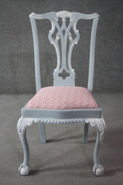 A set of six painted Chippendale style dining chairs with carved and pierced splat backs above drop in seats on carved cabriole ball and claw supports.