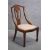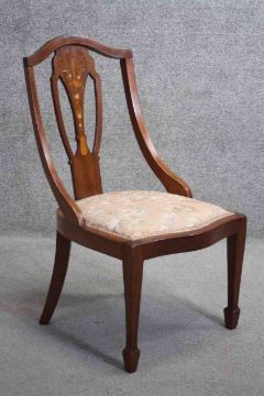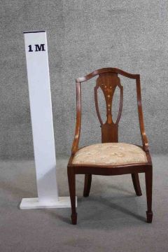 An Edwardian mahogany bedroom chair with scrolling ribbon and foliate inlay on tapering supports terminating in spade feet.
