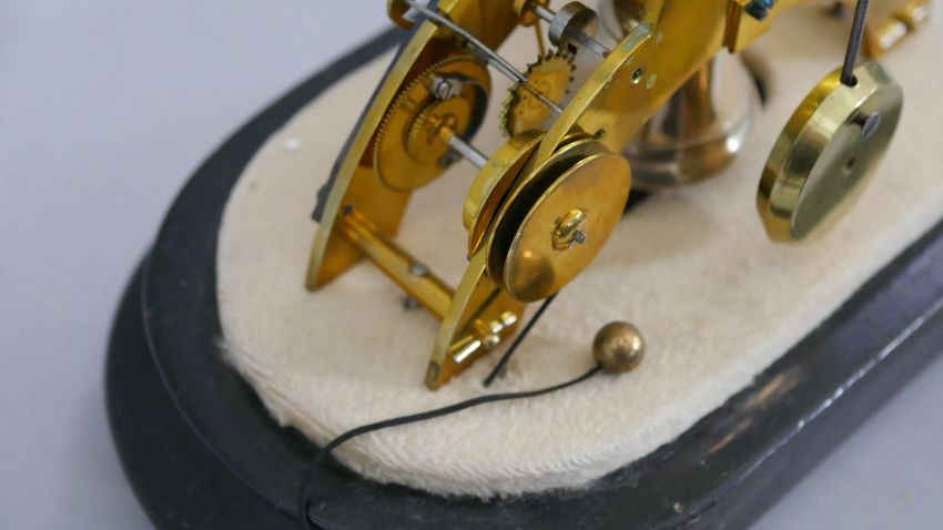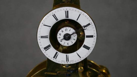 A small French brass skeleton clock with alarm, the white enamel chapter ring enclosing a central alarm dial on arched supports above a silvered bell, with glass display dome and pendulum. Stamped Gans a Paris. H.28 W.22 D.14 cm