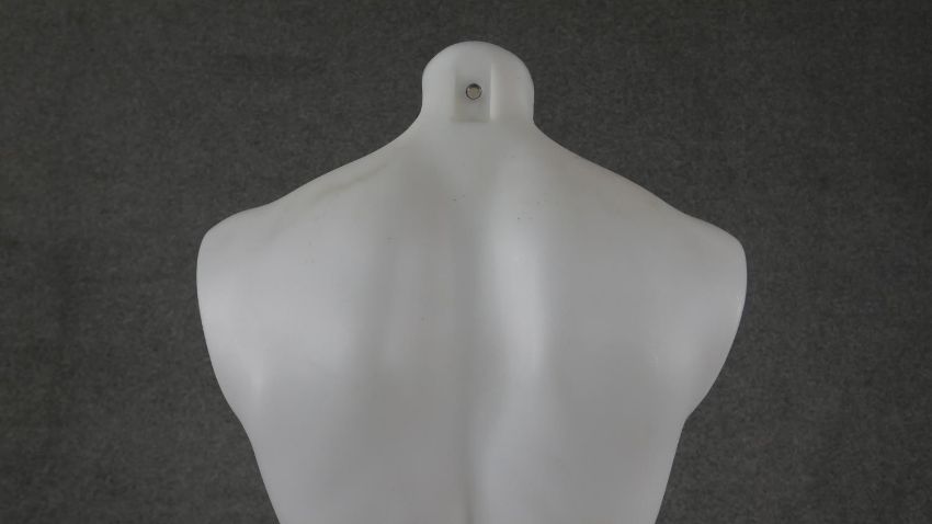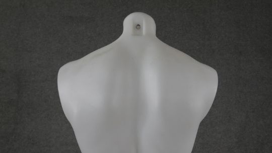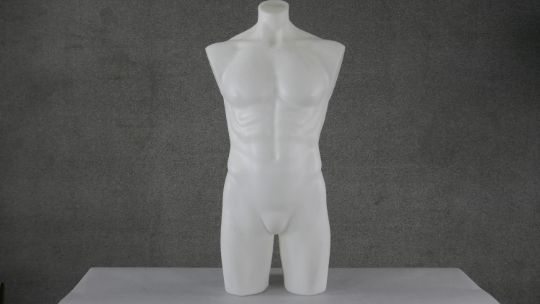 A frosted fibreglass male torso shop mannequin. H.95 W.44cm