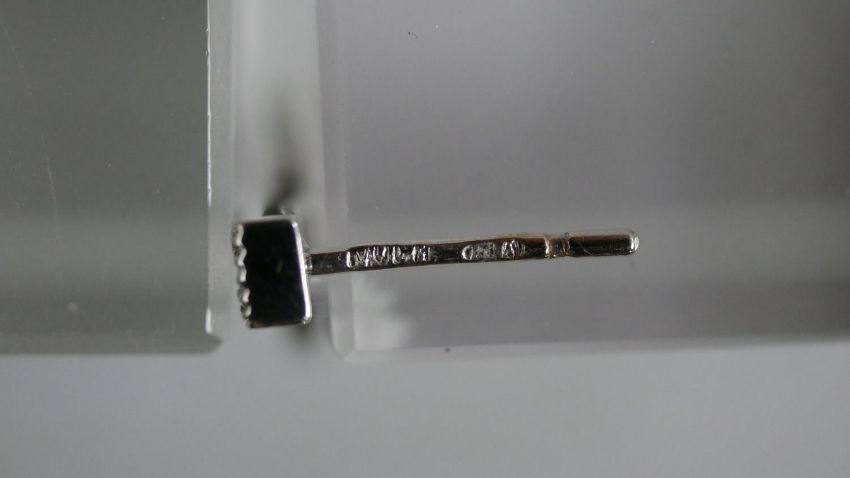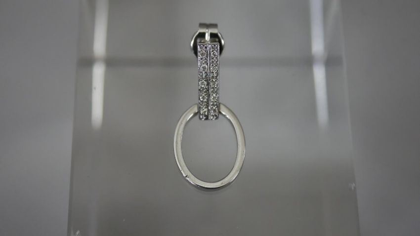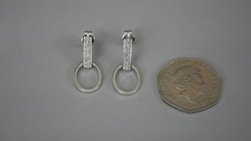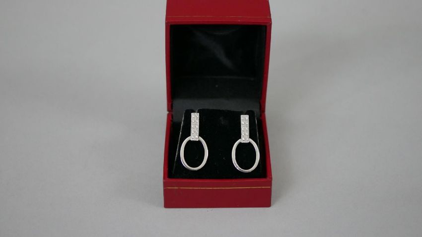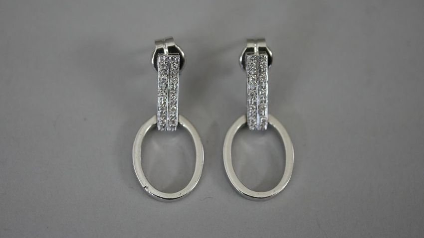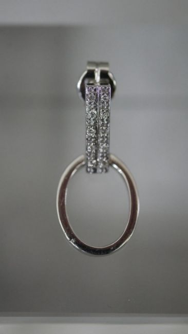 A pair of white metal (tests as platinum) and diamond articulated stirrup earrings with butterflies. Each earring set with ten round eight cut diamonds, both earrings with a combined approximate carat weight of 0.20 carats. Posts stamped. 5.3g