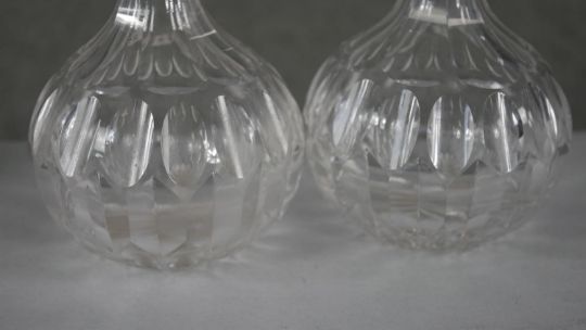 Four 19th century petal cut crystal decanters with stoppers. (two original) H.22 W.12cm (largest)
