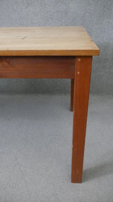 A Retrouvius refectory dining table with reclaimed poplar planked top raised on square tapering supports. H.74 W.200 D.86cm