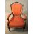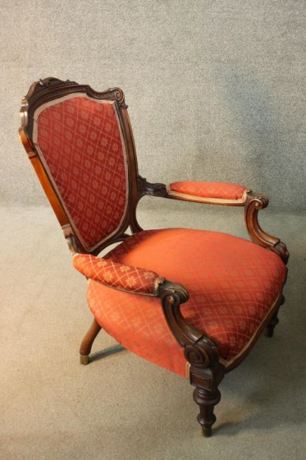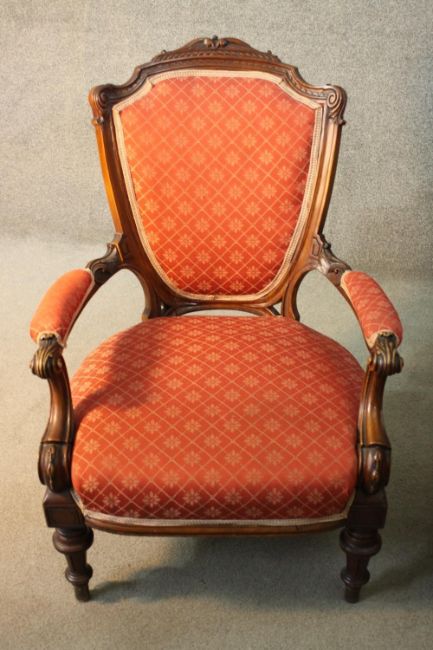 A late 19th century carved mahogany armchair in geometric floral upholstery on fluted tapering supports.