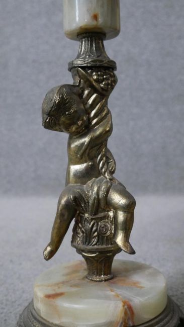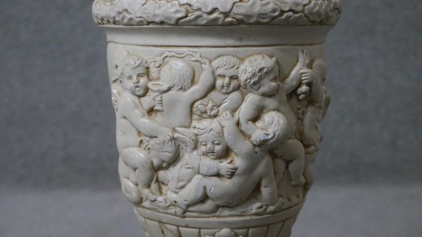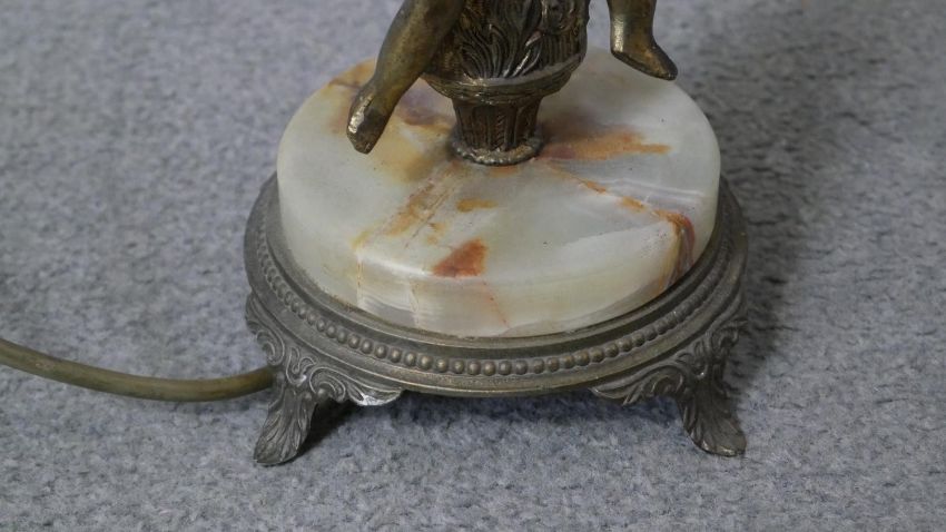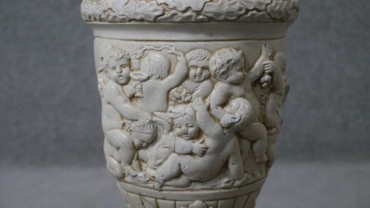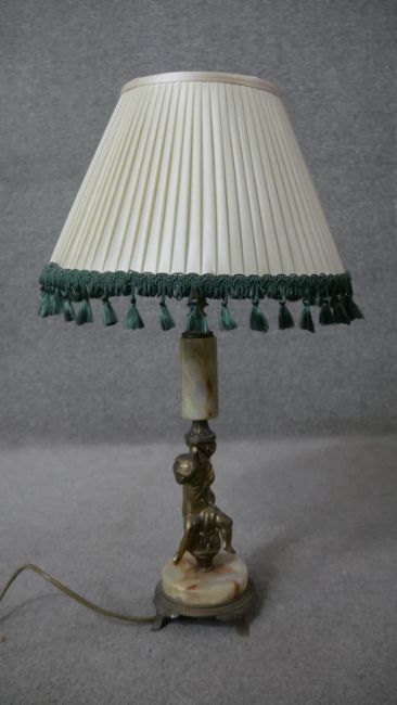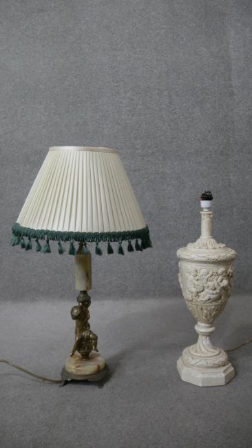 Two classical style table lamps. One vintage alabaster and gilt spelter cherub lamp along with a relief plaster lamp on hexagonal base. H.41 Diam.36cm (largest)
