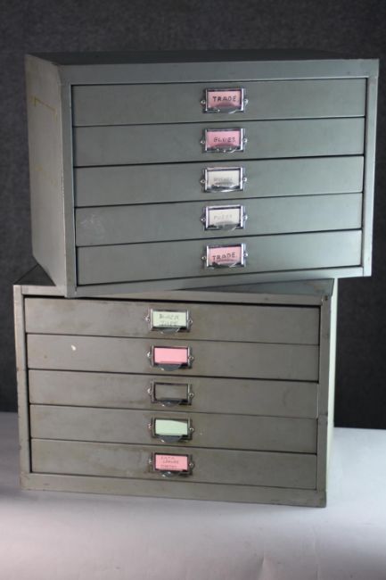 A pair of metal desk top specimen or stationery cabinets. H.30 W.45 D.30 cm (each)