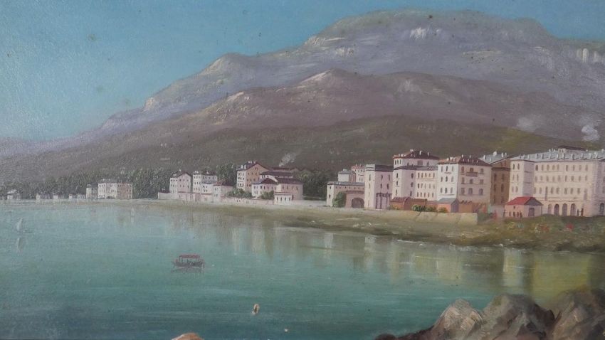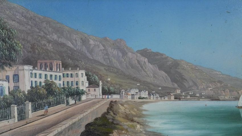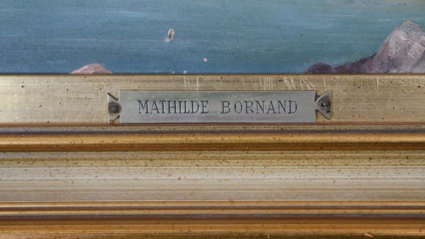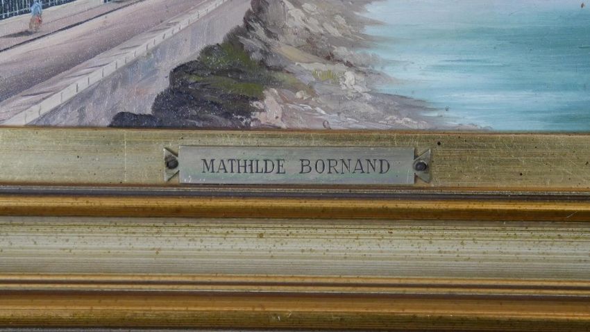 Two gilt framed oils on canvas of Continental coastal townscapes. With metal name plaques; Mathilde Bornand. H.26 W.38cm