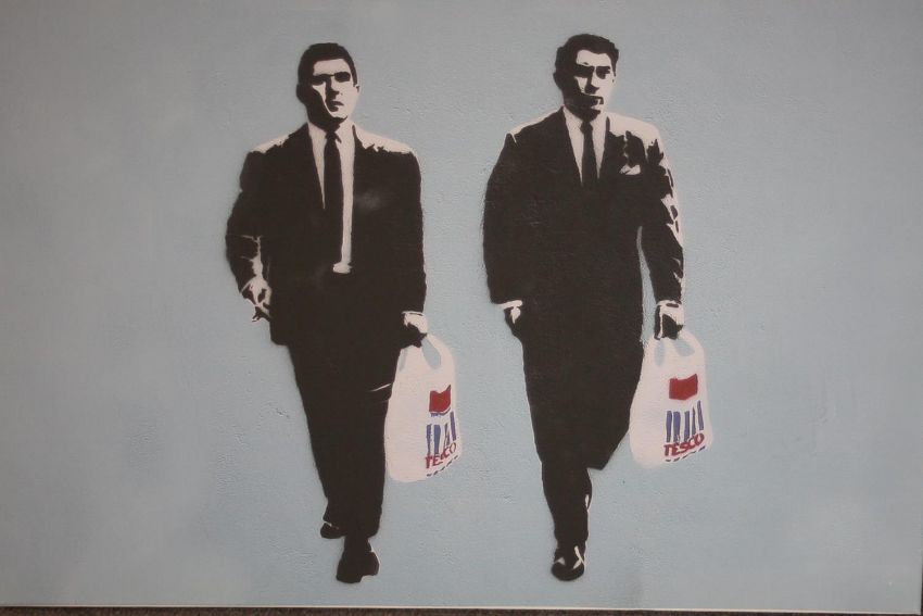 Four Banksy reproduction prints on canvas. H. 63 W.91cm.