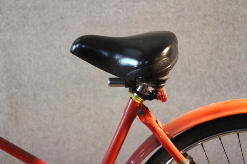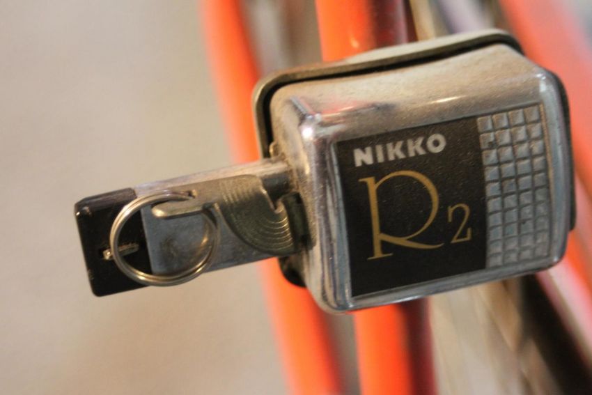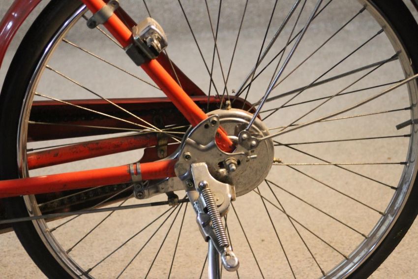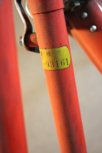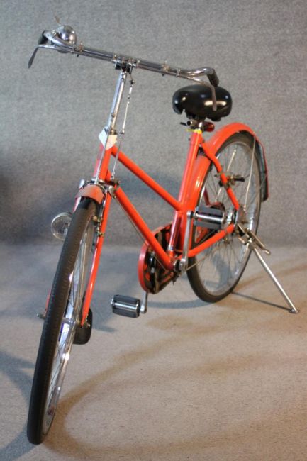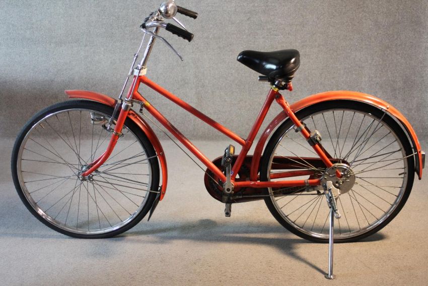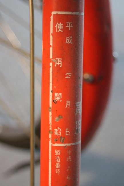 A vintage red Japanese post service bicycle. Makers label. Wheel dia. 60cm.