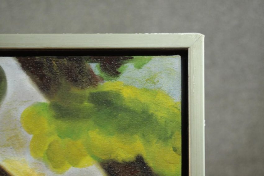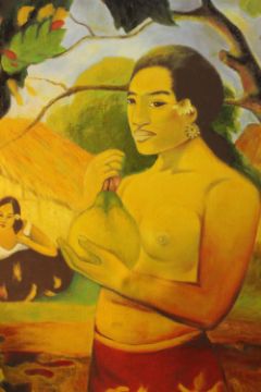 After Paul Gauguin- A framed oil on canvas of a woman holding fruit. Unsigned. H.98 W.78cm.