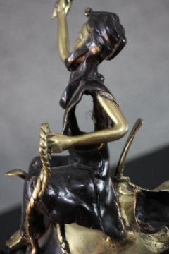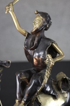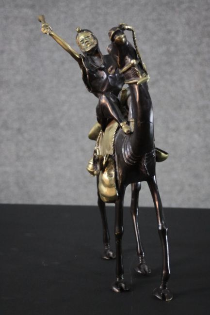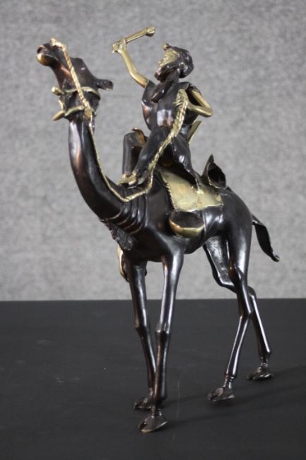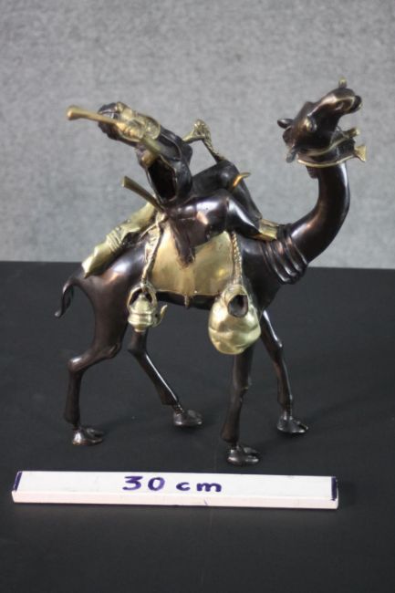 A West African hand made bronze sculpture from Burkina Faso of a camel and rider. Blackened to highlight the intricate detailing. H.40 W.30cm.