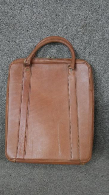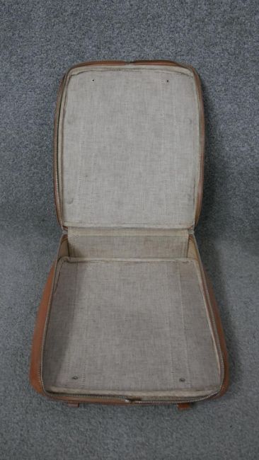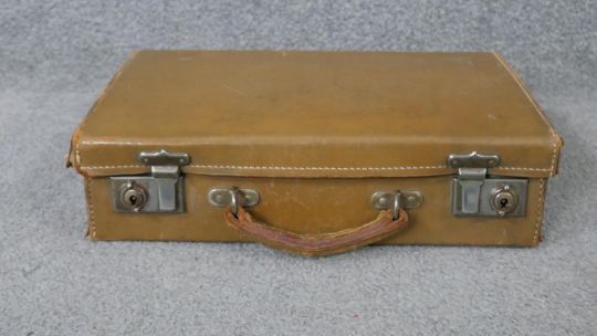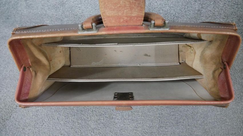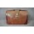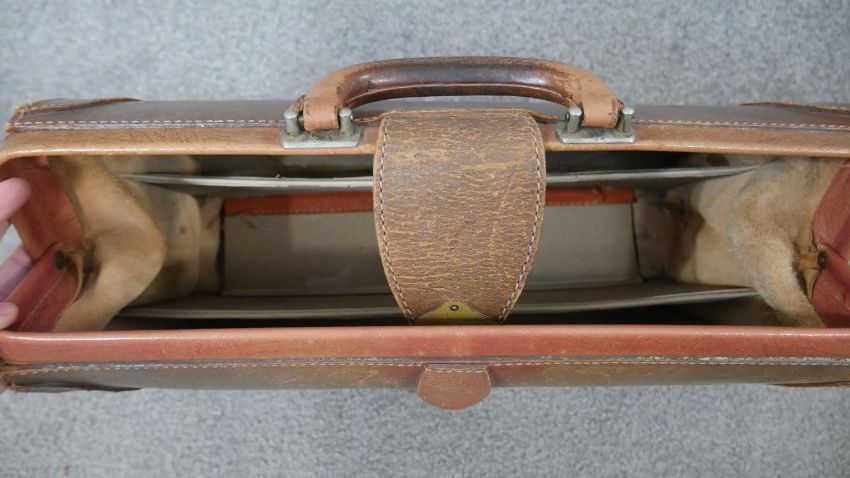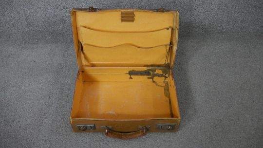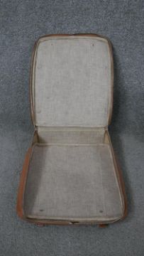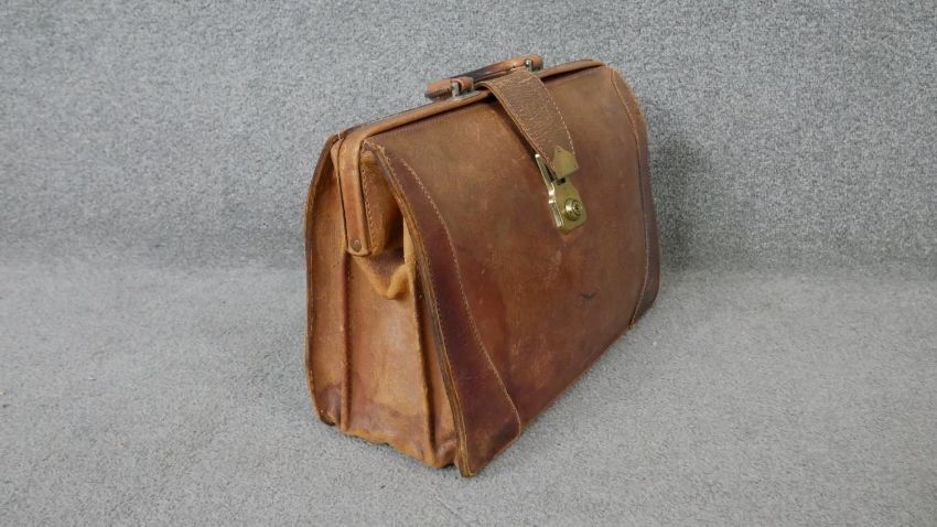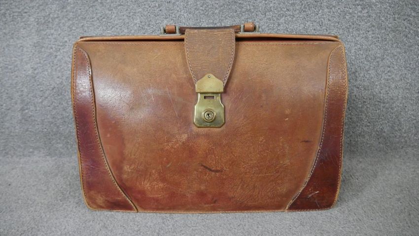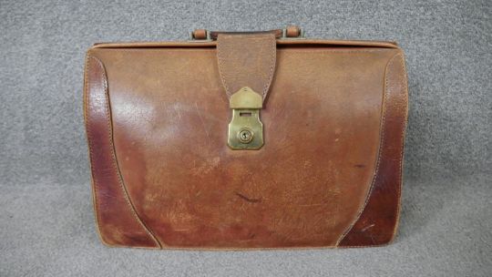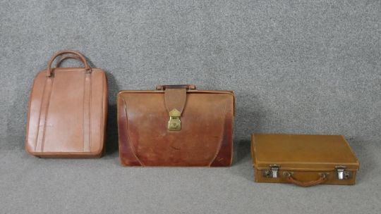 Three vintage tan leather bags. One tan leather doctors bag with brass fittings and two other pieces of luggage. H.28 W.42 D.16 cm (largest)