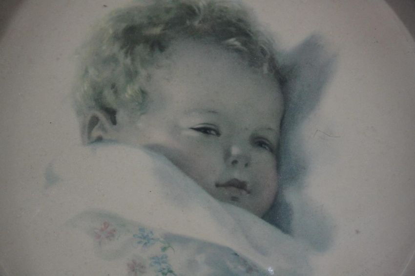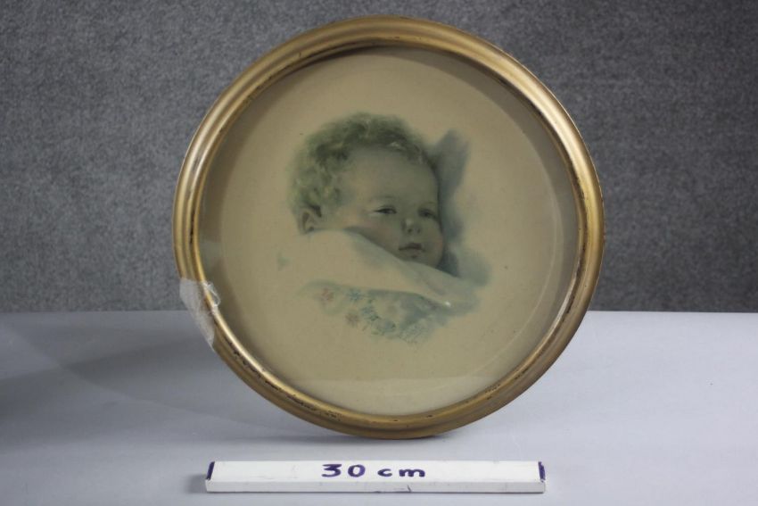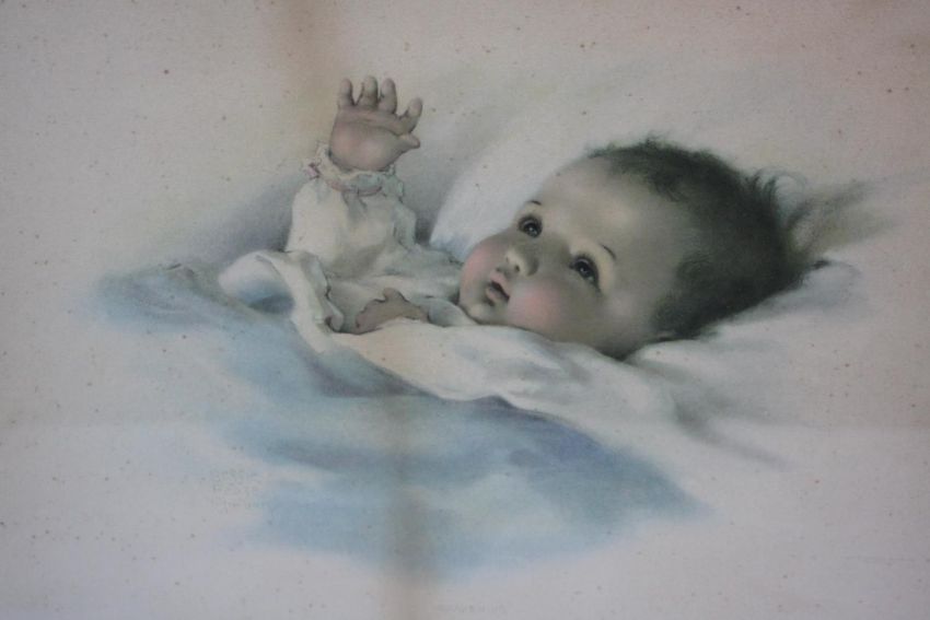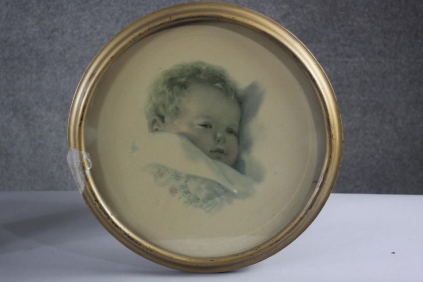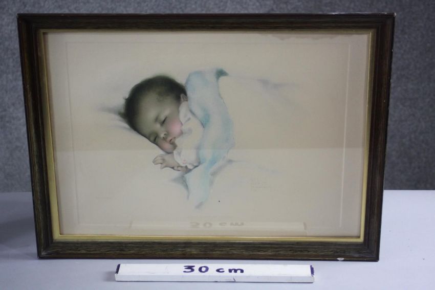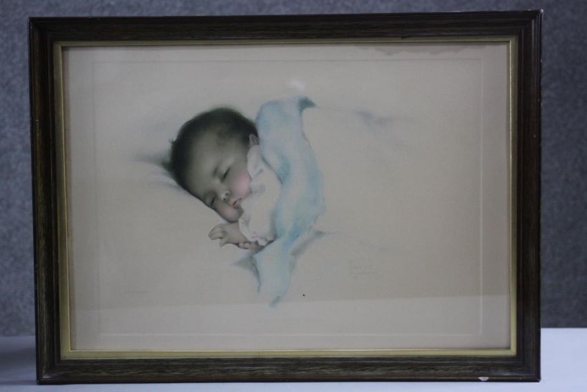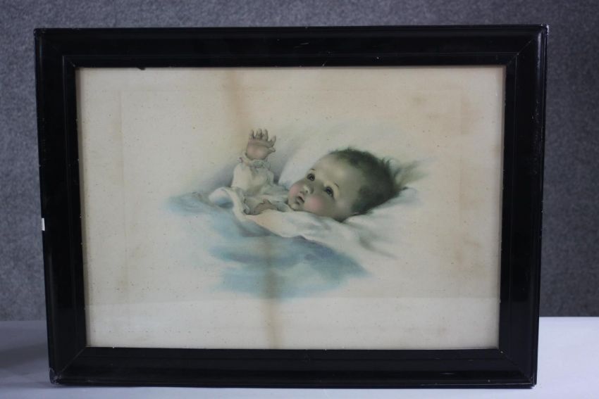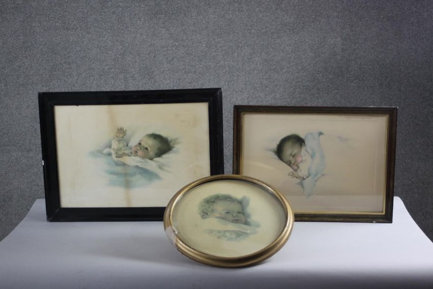 Three framed and glazed vintage Bessie Pease Gutmann prints of babies, signed in plate. H.54 W.62 cm (largest).