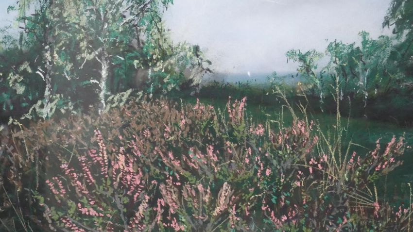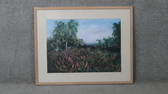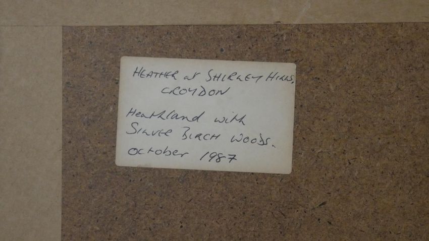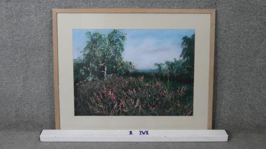 A framed and glazed oil pastel on paper titled ' Heather at Shirley Hills, Croydon', Unsigned, label verso. H.69 W.86cm