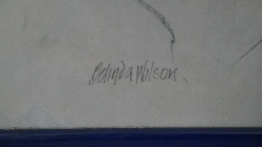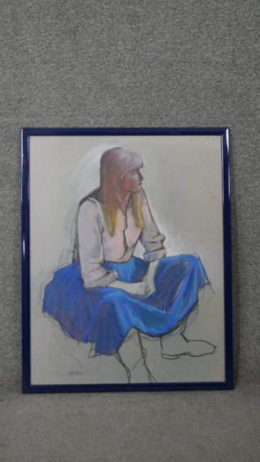 Belinda Wilson (1954-) A framed and glazed pastel on paper of a seated woman in blue skirt. Signed by artist. H.77 W.61cm