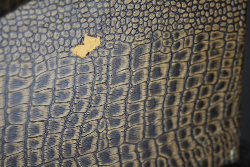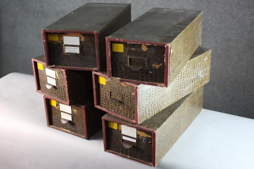 A collection of six vintage faux crocodile skin desk top filing boxes. H.12 W.17 D.39cm.