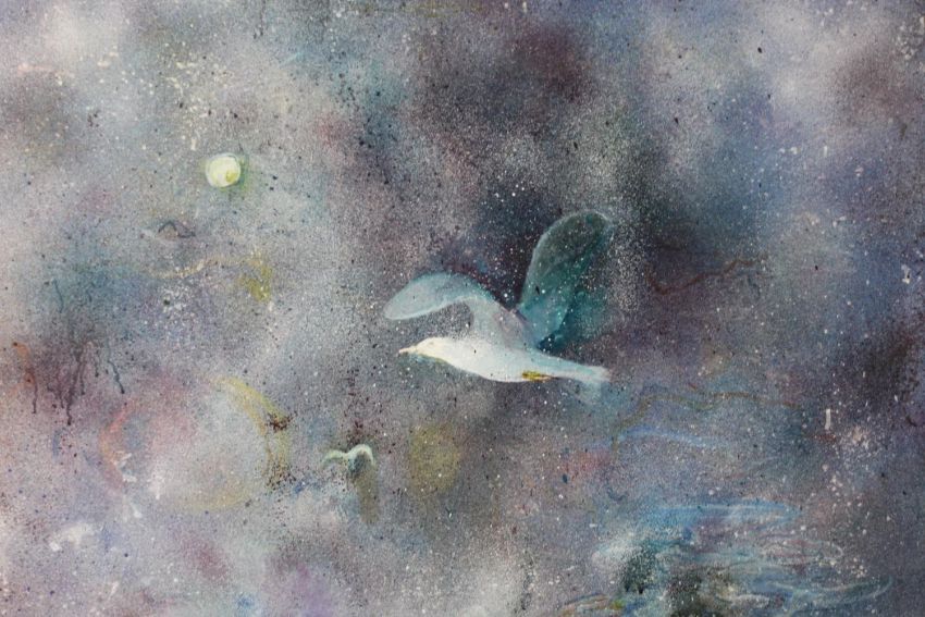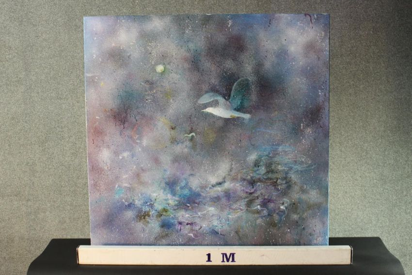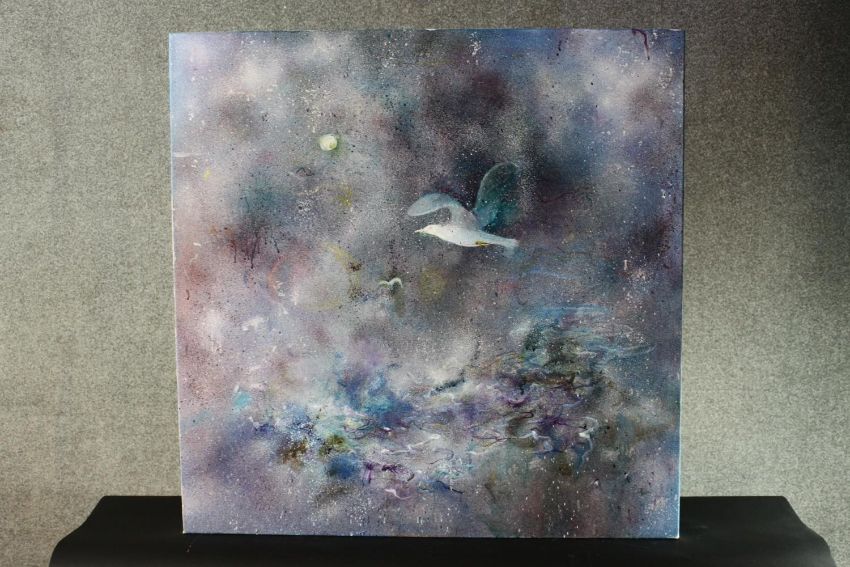 Jane Harris (1956-) An oil on board of a seagull in stormy sky. H.90 W.90cm.