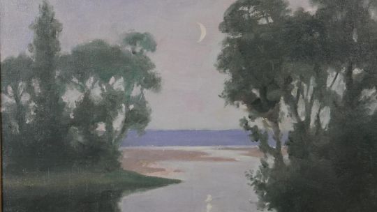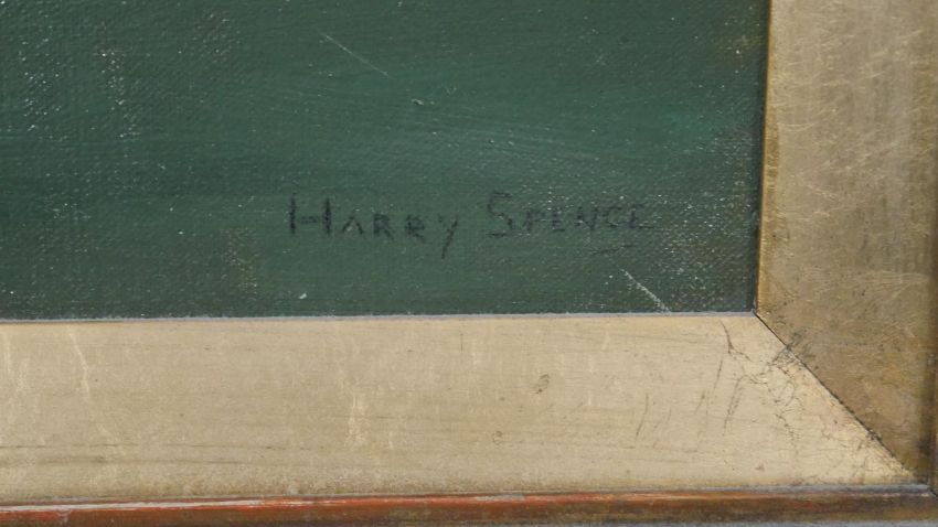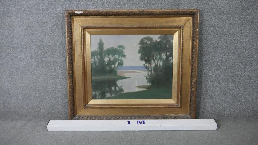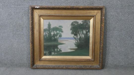 Harry Spence (1860 - 1928) - A gilt framed and glazed oil on canvas of a riverscape titled 'Twilight', signed by artist and label verso. H.69 W.78cm
