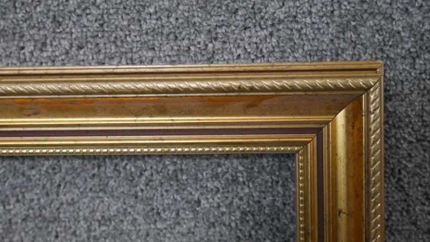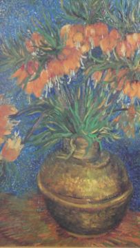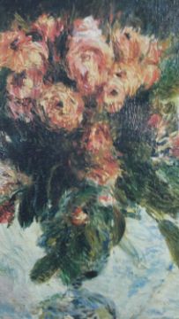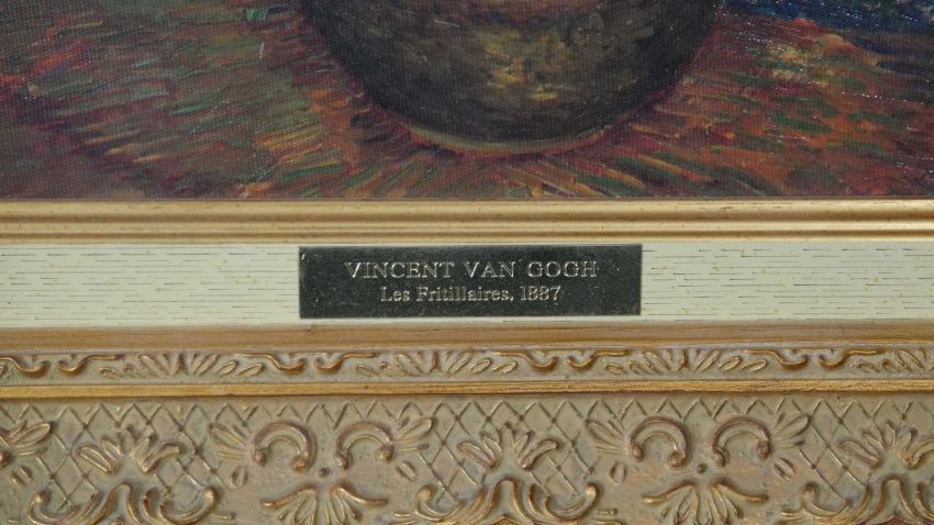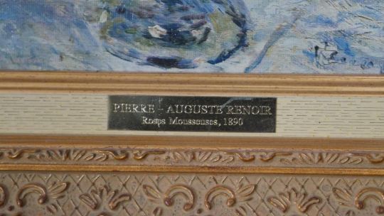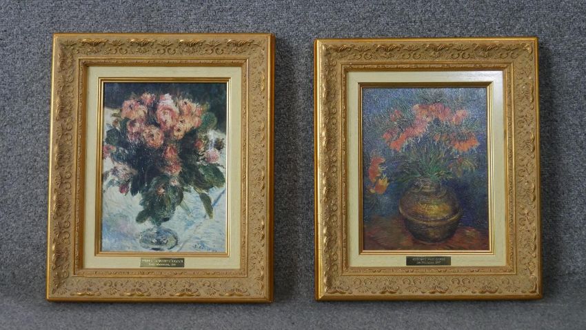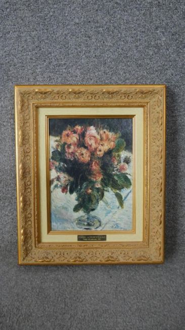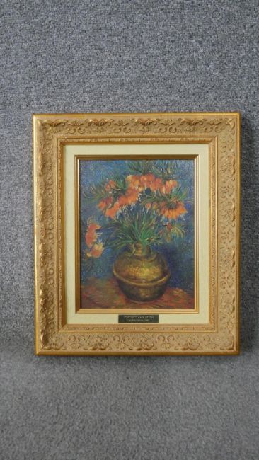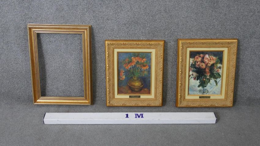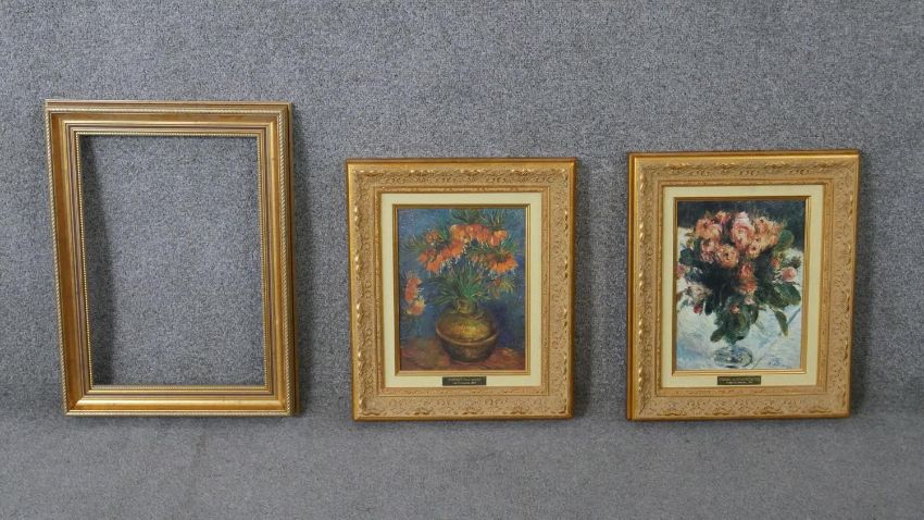 Two framed and glazed varnished prints of oil still life's. One by Renoir and one by Van Gogh and a similar gilt frame. H.42 W.35cm.Empty frame H.40 W.28cm (internal) H.50 W.37cm (external).