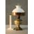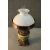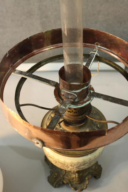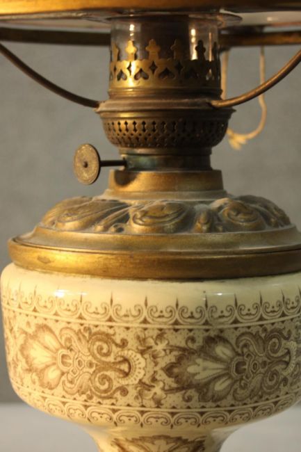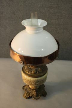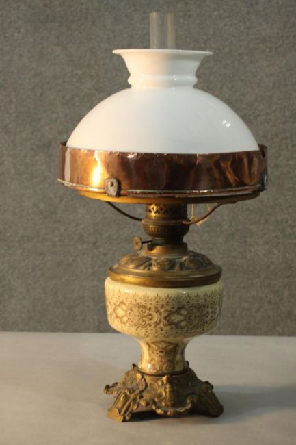 A Swedish copper and brass oil lamp with ceramic body and milk glass shade. H.54 Dia.26cm.